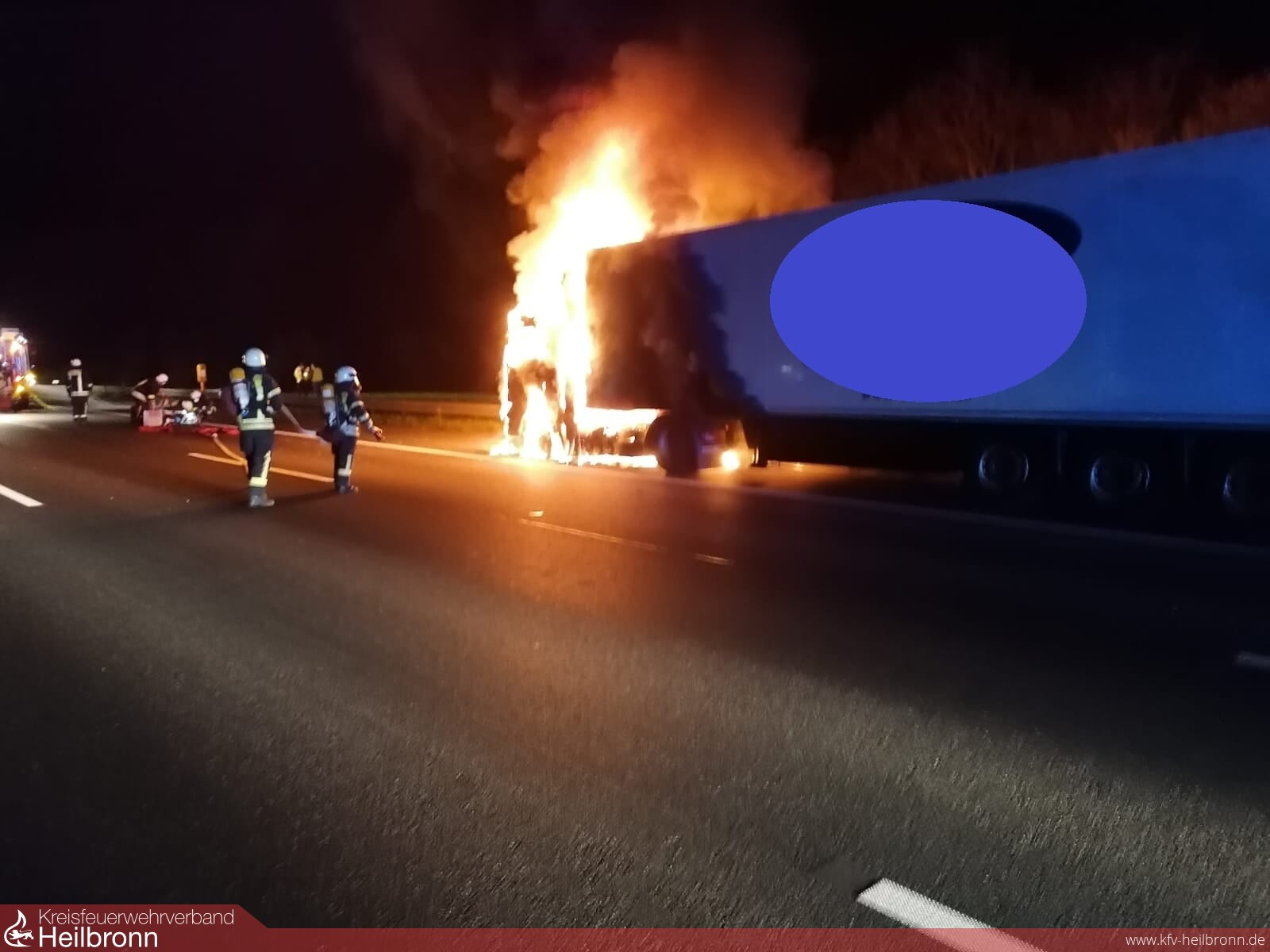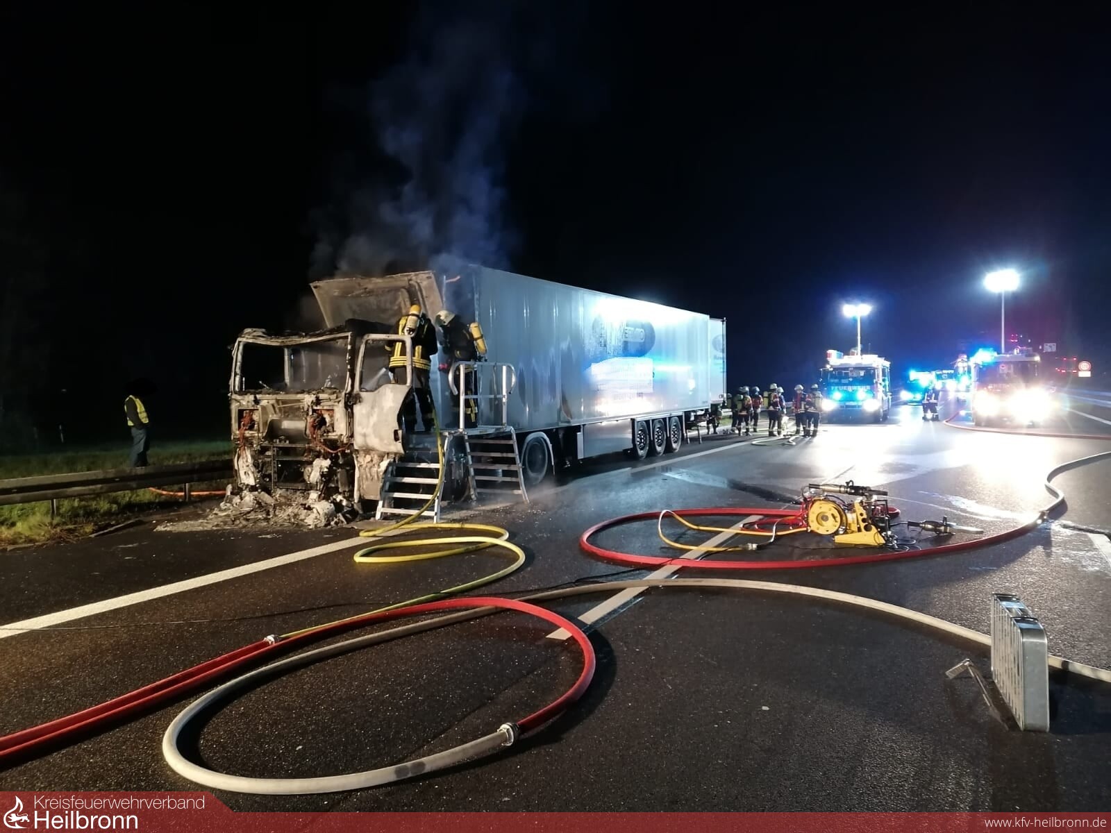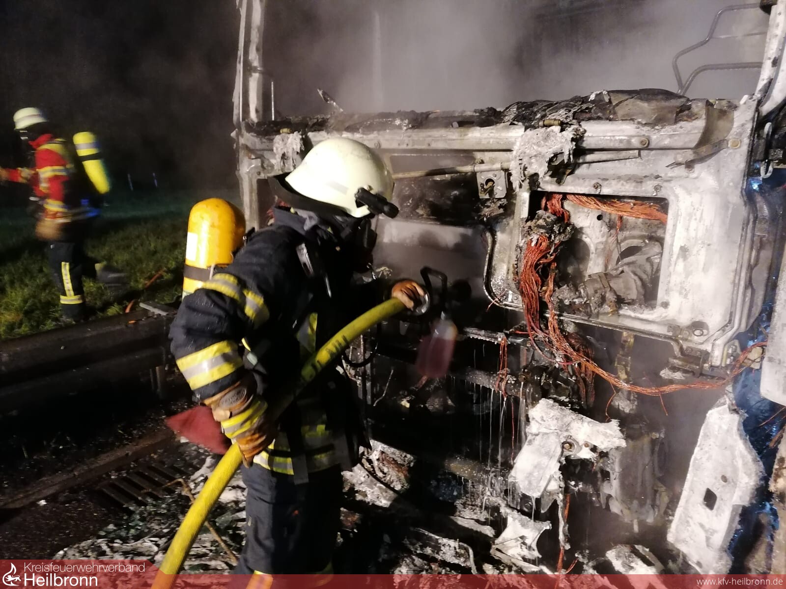 Bereits beim Eintreffen des ersten Fahrzeuges der Feuerwehr Ilsfeld, befand sich die Zugmaschine des LKW in Vollbrand. Aufgrund der nicht vorhandenen Wasserversorgung auf der Autobahn, war eine größere Zahl an Löschfahrzeugen nötig um das Feuer zu löschen. Die Feuerwehr Ilsfeld hatte 3 Löschfahrzeuge und die Feuerwehr Mundelsheim und Großbottwar auch noch jeweils 1 Löschfahrzeug im Einsatz. Die Zugmaschine konnte noch vor dem vollständigen Übergreifen der Flammen auf den Auflieger gelöscht werden.