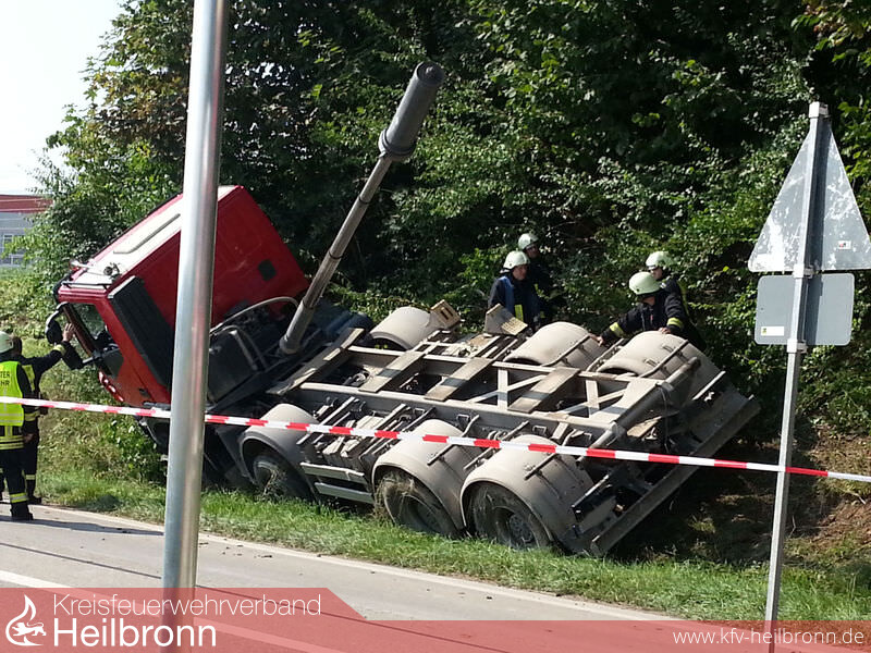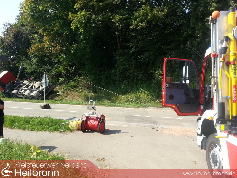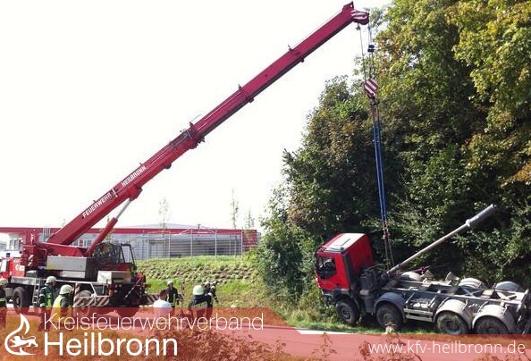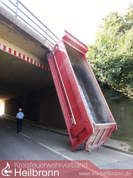 Der Laster wurde mit dem Kran der Heilbronner Feuerwehr geborgen und durch die Seilwinde vom HLF der Feuerwehr Ilsfeld gegen umkippen abgesichert. Die Mulde wurde mit einem großen Kettenbagger unter der Brücke hervorgezogen und vom Kran gesichert.