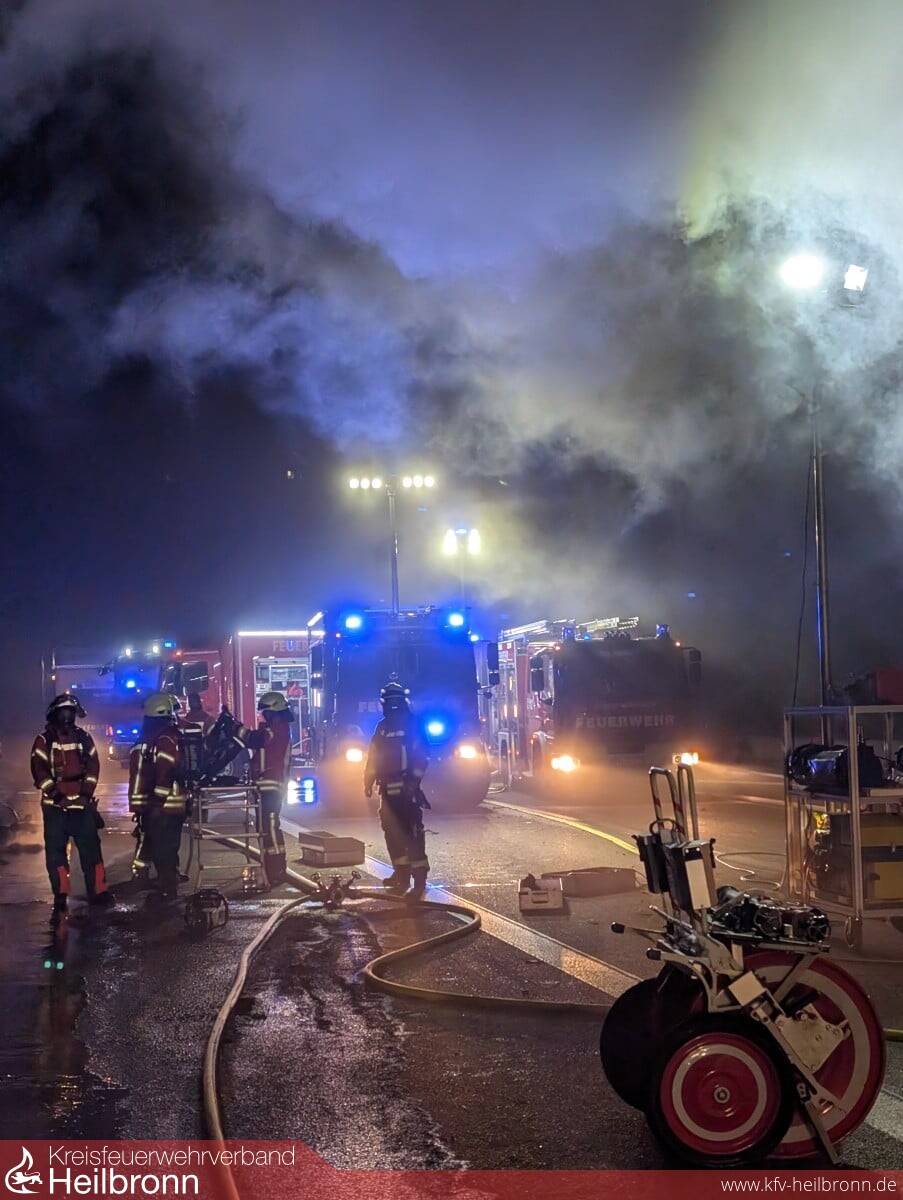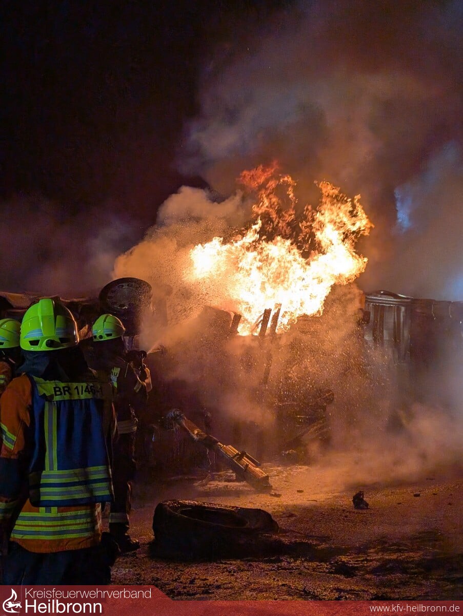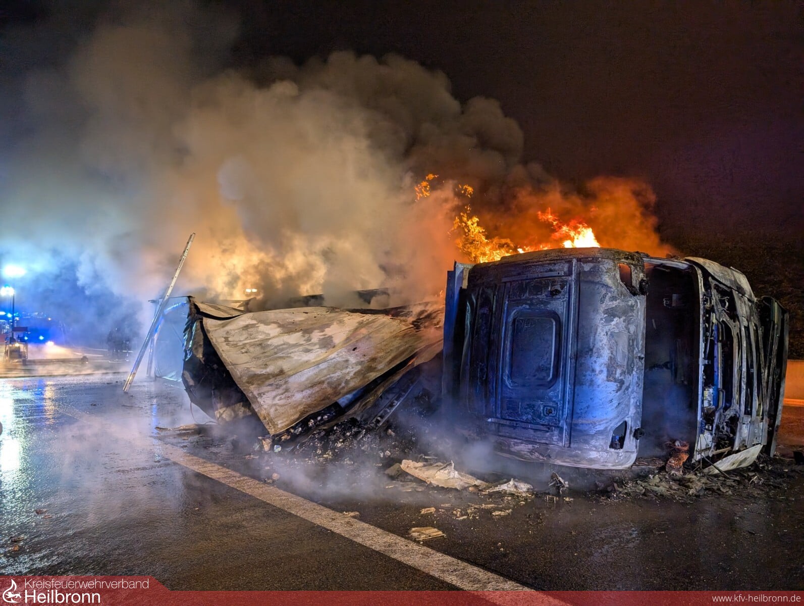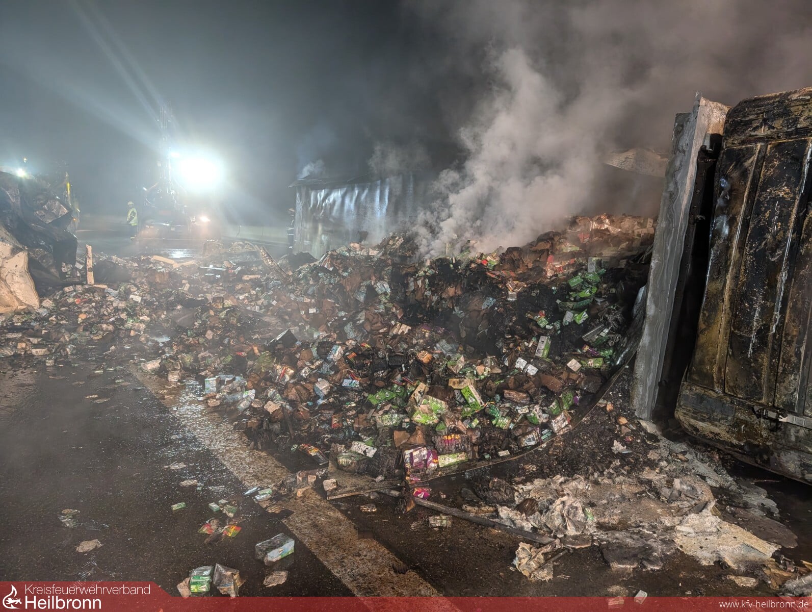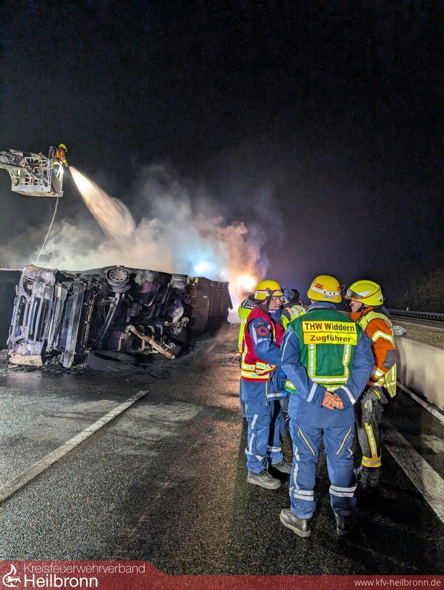 Bereits auf der Anfahrt staute sich der Verkehr erheblich und eine schlecht gebildete Rettungsgasse erschwerte das Durchkommen zusätzlich. Nach Angaben der Polizei Heilbronn war ein Sattelzug nach einem Verkehrsunfall ins Schleudern geraten, umgekippt und in Brand geraten. Beim Eintreffen der ersten Einsatzkräfte stand der gesamte Lkw, geladen mit Süßwaren, bereits in Vollbrand, auch Dieselkraftstoff war bereits ausgelaufen und hatte mehrere Meter in Flammen gestanden. Glücklicherweise konnte sich der Fahrer selbst aus dem LKW befreien und wurde nur leicht verletzt.