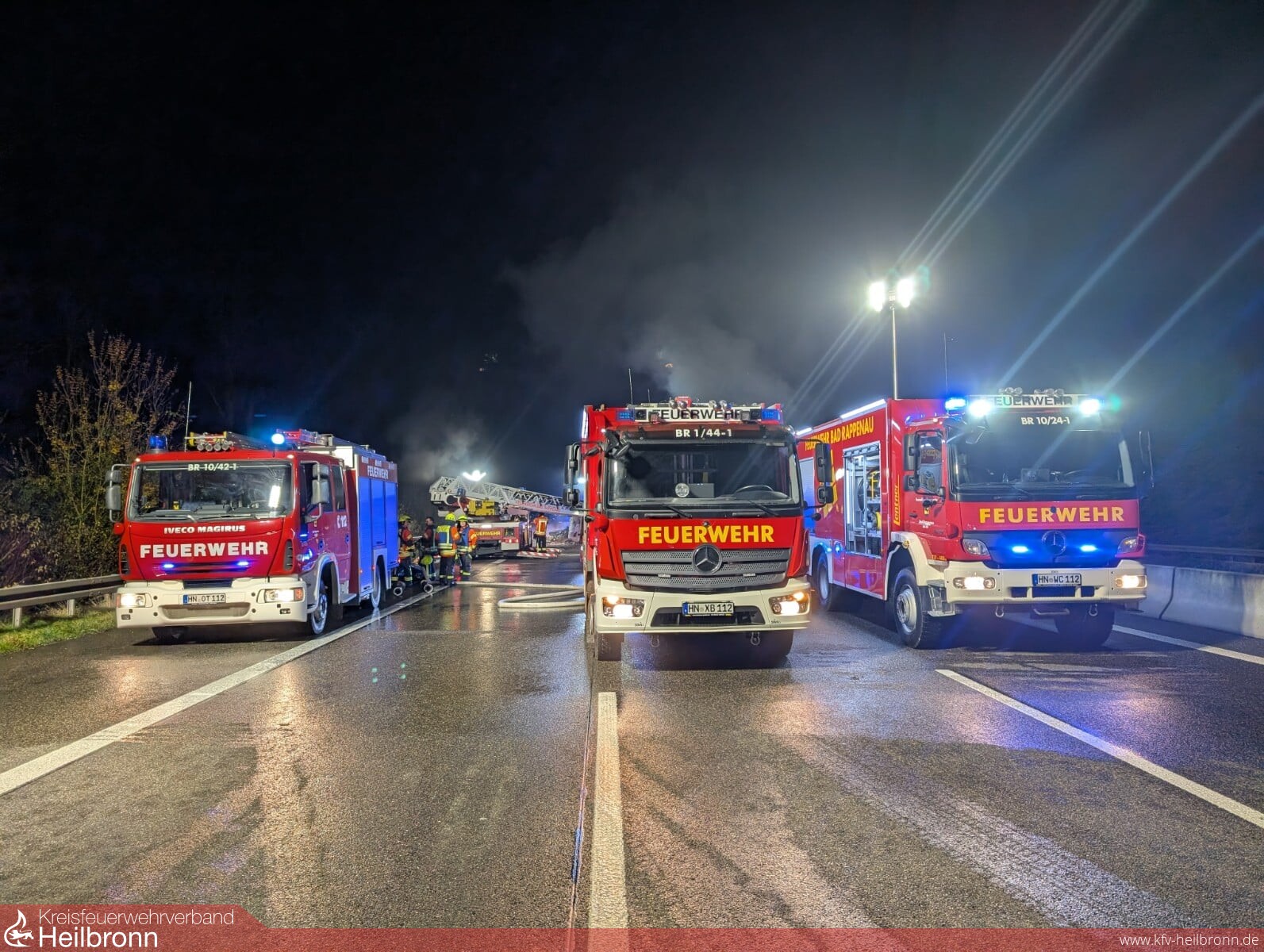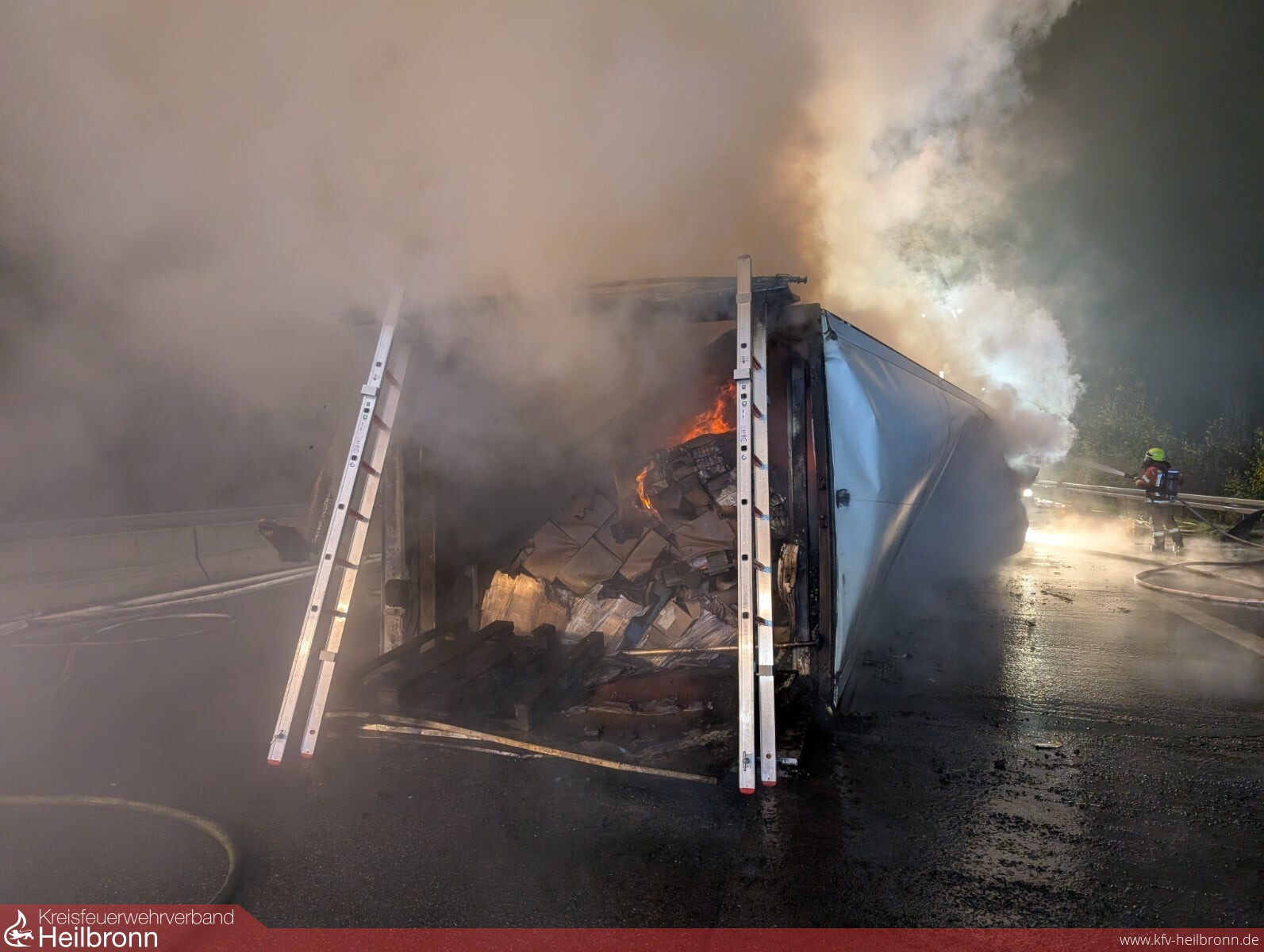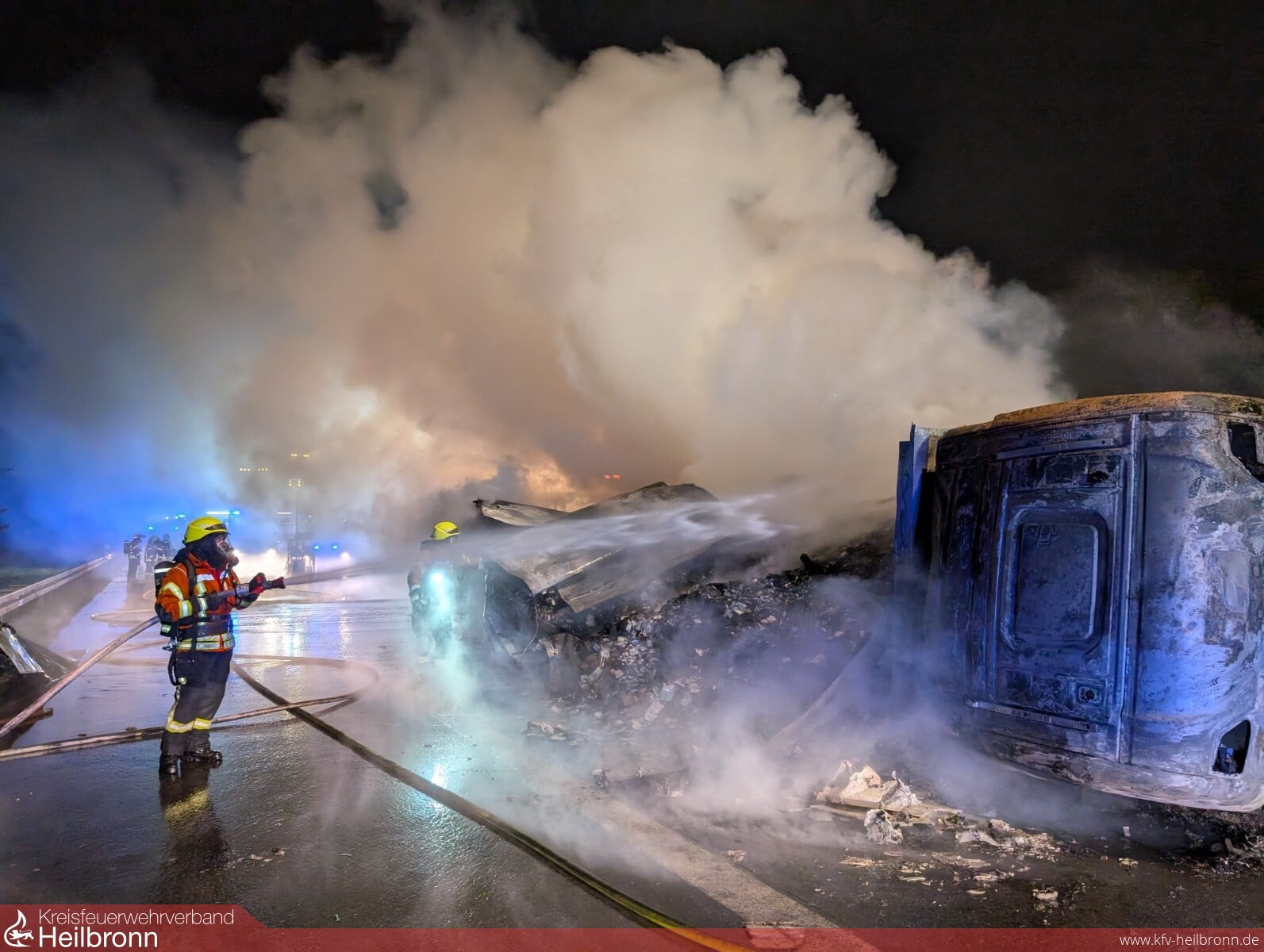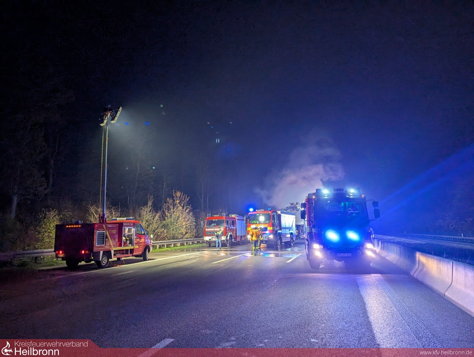 Aufgrund dieser Lage, d.h. der ausschließlichen Konzentration auf die Brandbekämpfung, entschied sich der Einsatzleiter zeitnah, die Feuerwehr Sinsheim zur Unterstützung - vor allem auch zur Sicherstellung einer ausreichenden Wasserversorgung - nachzualarmieren. Mit Unterstützung der Autobahnpolizei konnte die Autobahn aufgrund der starken Rauchentwicklung zeitnah in beide Fahrtrichtungen voll gesperrt werden, auch, dass nachrückende Einsatzkräfte die Einsatzstelle entgegen der Fahrtrichtung effektiv über die Autobahn von beiden Seiten erreichen konnten.
