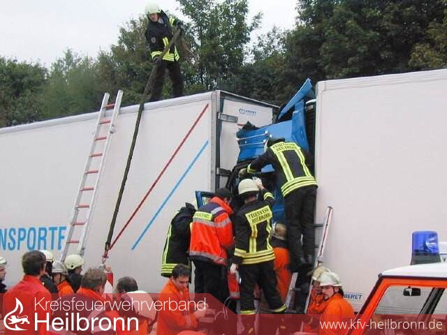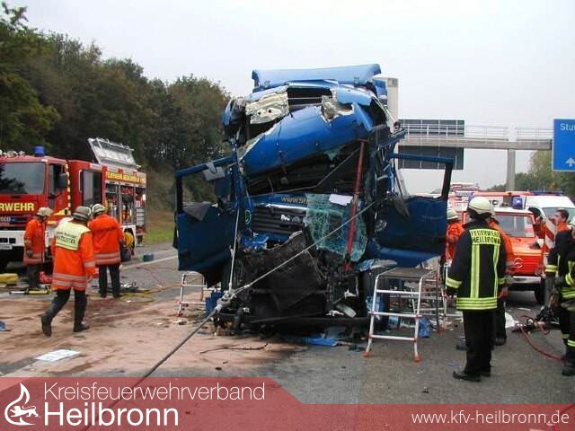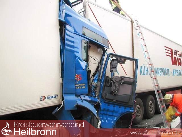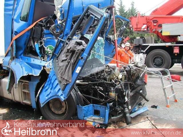 Der Unfallverursacher wurde massiv in seinem Führerhaus eingeklemmt. Er musste von den Feuerwehren Heilbronn und Neckarsulm unter Einsatz von zwei Zugeinrichtungen, des Feuerwehrkrans und hydraulischen Rettungsgeräten aus dem Wrack befreit werden.