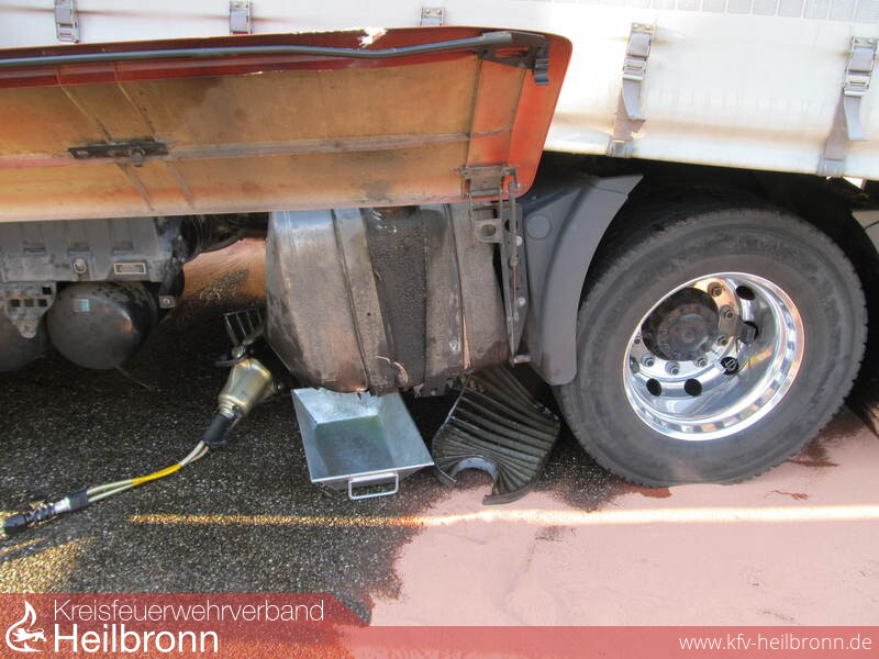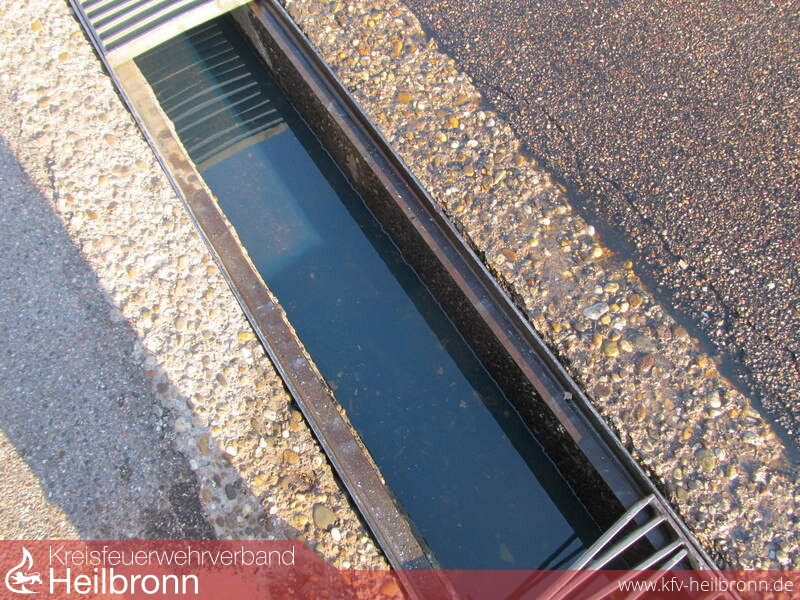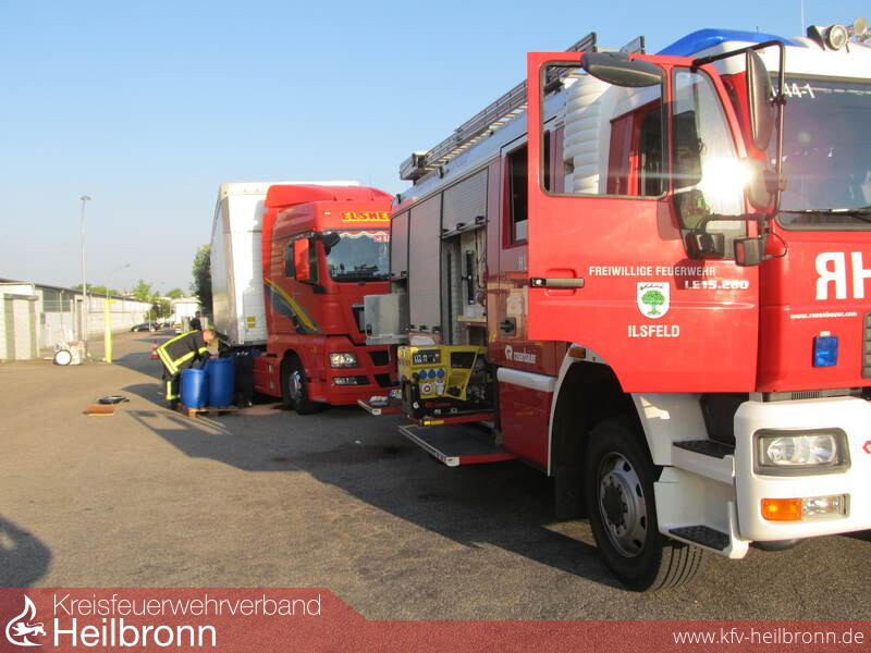 Die Feuerwehr Ilsfeld wurde über die ILS Heilbronn mit dem Alarmstichwort Auslaufender Kraftstoff/Öl zu einer Spedition im Ilsfelder Industriegebiet alarmiert. Beim Eintreffen der Feuerwehr lief bereits eine große Menge Diesel aus dem Tank eines LKW's in einen Abwasserschacht. Beim überfahren eines Gitterrostes mit dem LKW stellte sich dieser auf, bohrte dabei ein Loch in den Tank und riss die Kraftstoffleitungen ab. Die Feuerwehr klemmte die Kraftstoffleitungen zu, und pumpte mit einer Druckluftpumpe noch ca. 300l Diesel in Fässer ab. Die Fläche wurde mit Bindemittel abgestreut und der Abwasserkanal längere Zeit gründlich mit Wasser durchgespült.