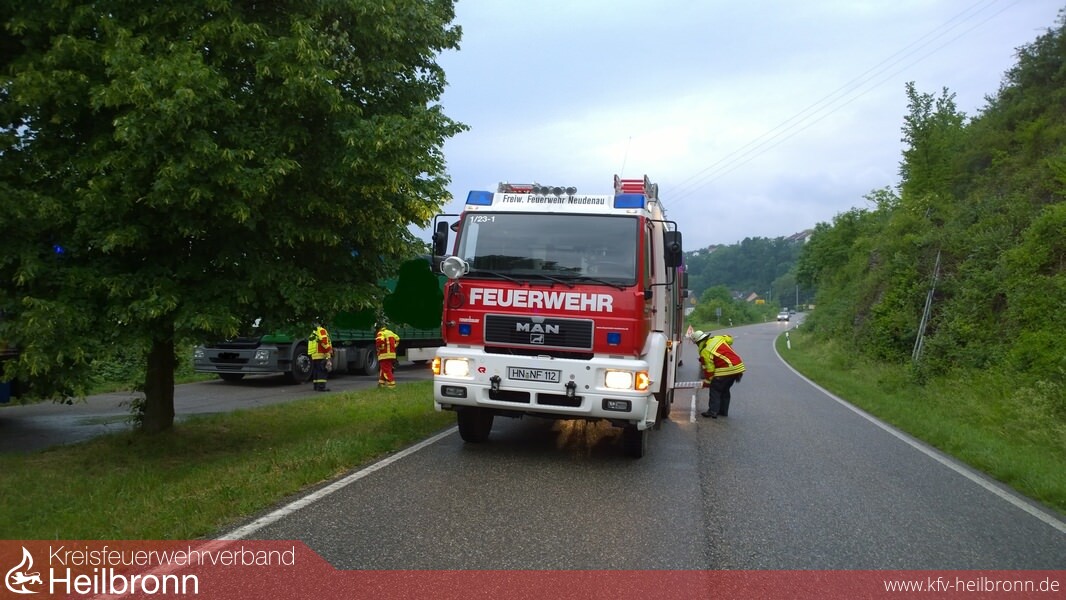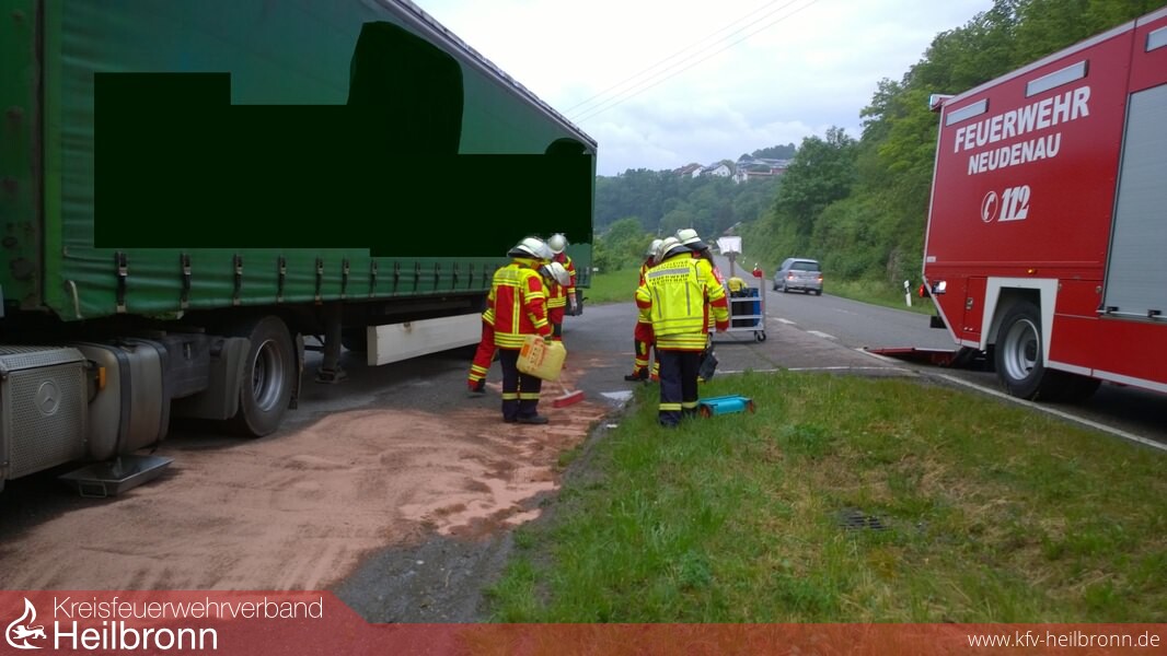 Mit dem Alarmtext „auslaufender Kraftstoff Lkw“ wurde die Einsatzabteilung Neudenau alarmiert. Beim Eintreffen war vom Lkw-Tank weg eine ca. 60-80 cm Breite und ca. 5 Meter lange Dieselspur feststellbar. Während die Besatzung des Tanklöschfahrzeugs (TLF 16/25) die Einsatzstelle gegen den fließenden Verkehr sicherte und den Brandschutz sicherstellte, beseitigte die Besatzung des Gerätewagens (GW-L2) den Dieselkraftstoff mittels Ölbindemittel. Über die Integrierte Leiststelle (ILS) Heilbronn konnte bei der Spedition des Lkw ein Verantwortlicher erreicht werden, der wiederrum den Fahrer verständigte. Der Fahrer kam vor Ort und es konnte sichergestellt werden, dass an dem Tank nicht manipuliert worden war. Er räumte ein zu voll getankt zu haben und dass deshalb der Dieselkraftstoff ausgetreten sei.
