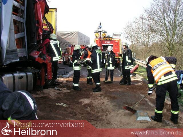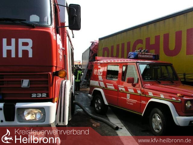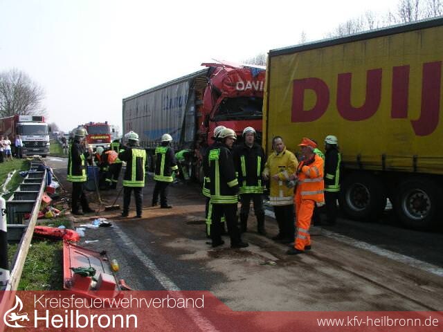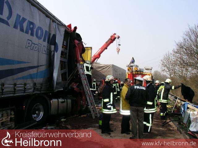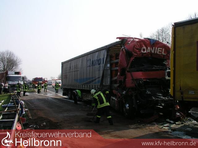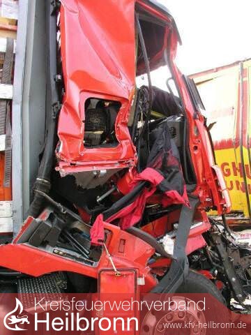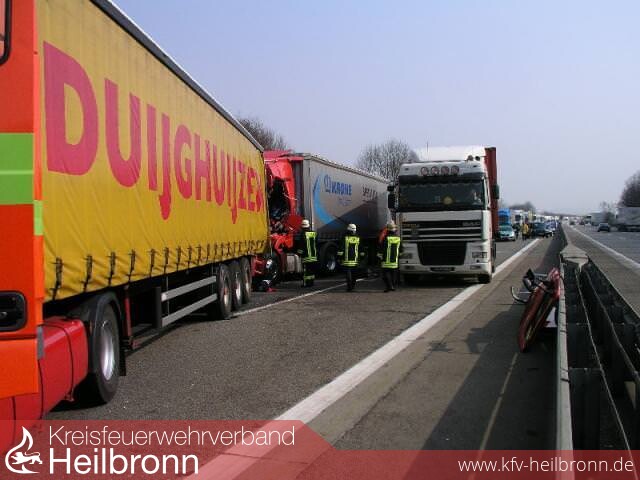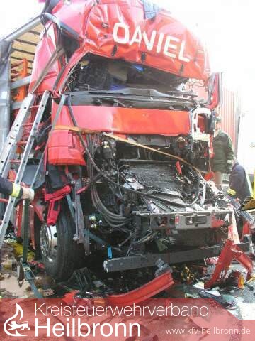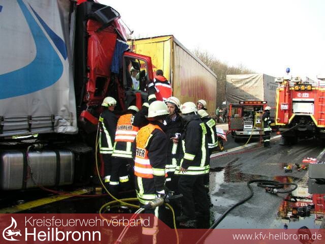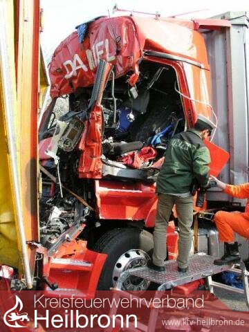 Infolge eines Staus fuhren vier Lastzüge ineinander. Hierbei wurden in einem der Lastzüge der Fahrer und sein Beifahrer schwerst verletzt in der total zertrümmerten Fahrerkabine eingeklemmt als die Rettungskräfte eintrafen.