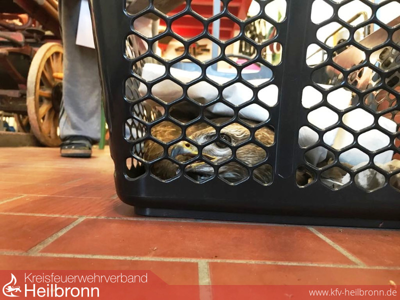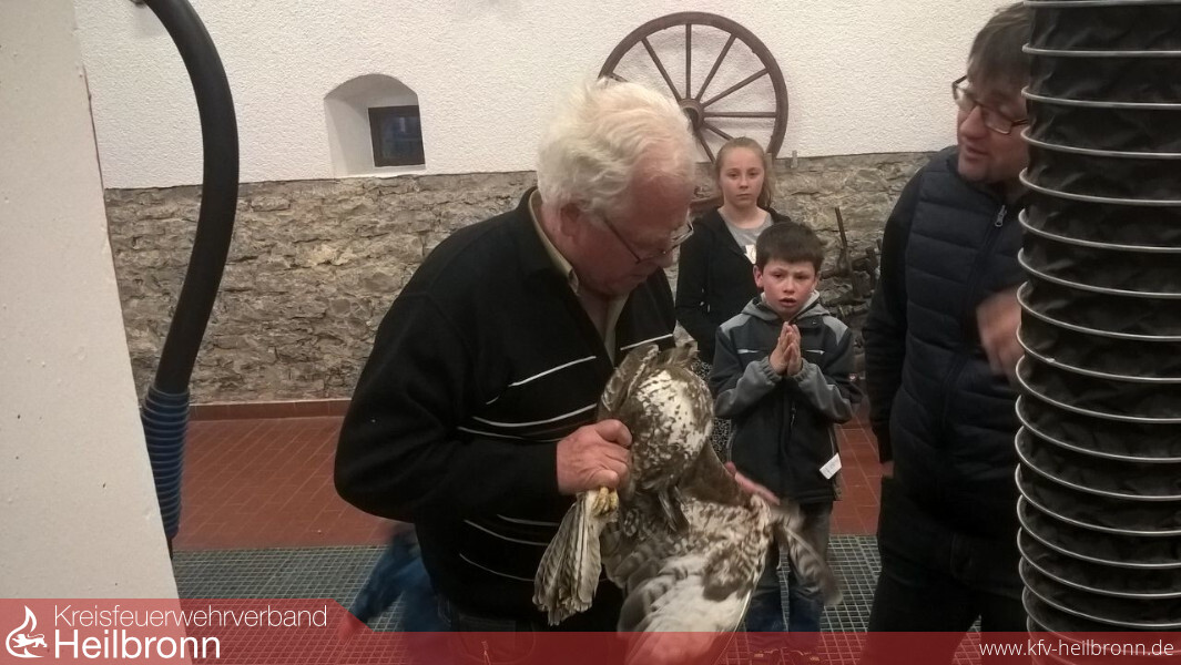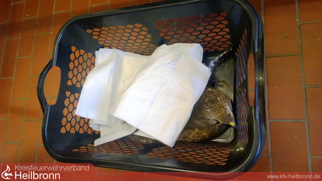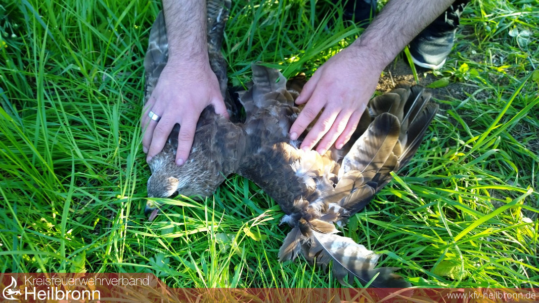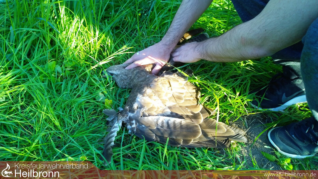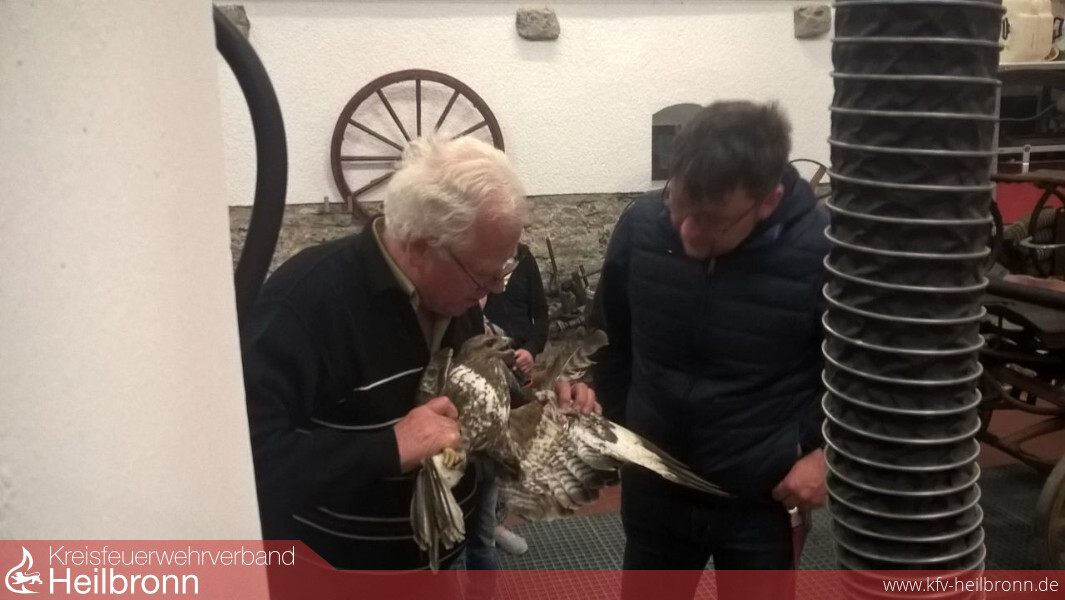 Blieb noch das Organisatorische zur weiteren Versorgung des Vogels zu regeln. Über die ILS Heilbronn konnte die Greifvogelstation Bad Friedrichshall verständigt werden. Ein Sachverständiger der Greifvogelstation meldet sich dann telefonisch beim Einsatzleiter vor Ort. Die Feuerwehr nahm den Bussard mit ins Feuerwehrhaus, wo er dann an den Sachverständigen übergeben werden konnte. Bei der ersten Untersuchung wurde festgestellt, dass der Vogel nichts gebrochen hat, aber noch einen Blinker mit Widerhaken im Flügel steckte. Dieser wurde ihm noch heute in der Greifvogelstation operativ entfernt. Nach etwas „Krankenhausaufenthalt“ sollte er dann auch wieder fliegen können.