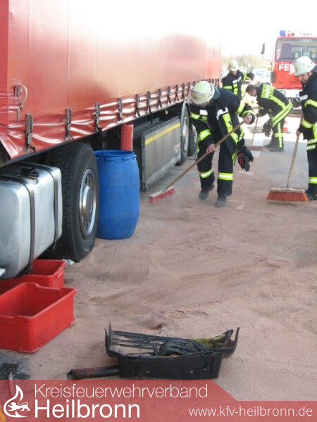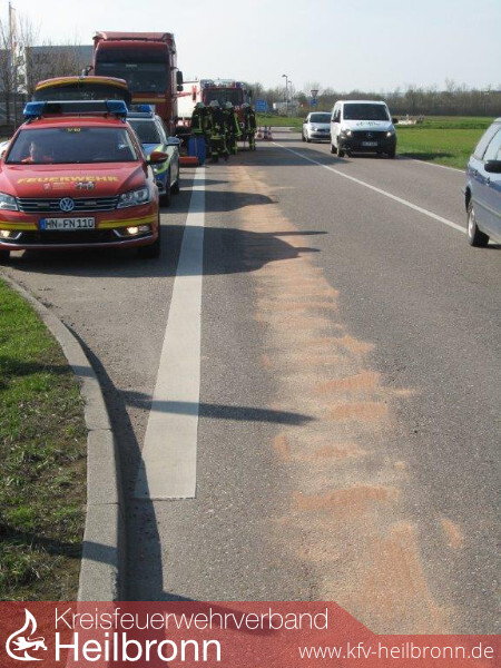 Die Feuerwehr Neuenstadt, Abt. Neuenstadt, fing den austretenden Kraftstoff mit Behältern auf und streute den gesamten Bereich mit Ölbindemittel ab. Die Straßenmeisterei Neuenstadt wurde verständigt, die die Fa. Biotec mit dem Reinigen der Fahrbahn beauftragte. Nach dem Wechseln des Hinterrades und stillsetzen der linken Tankseite, konnte der LKW die Fahrt weiter fortsetzen. Es hatte sich infolge der halbseitigen Sperrung der viel befahrenen Straße ein mehrere Kilometer langer Stau gebildet. Die Polizei regelte den Verkehr.
