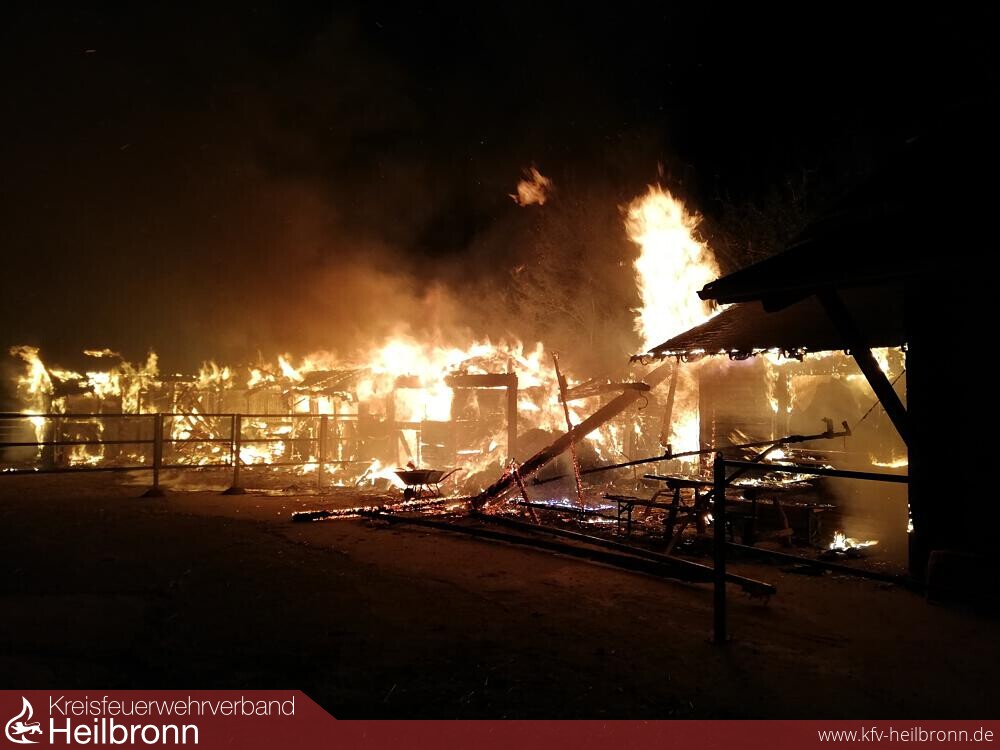 Mittwochmorgen, gegen 03.47 Uhr, gerieten aus bislang unbekannter Ursache mehrere Pferdeställe am nörlichen Ortsausgang von Gochsen, K 2012, in Brand. Fünf Pferde, die sich frei zwischen Weide und der offenen Pferdeställe bewegen konnten, brachten sich selbst in Sicherheit. In einer geschlossenen Stallung verbrannten eine Kuh und ein Pony. Das Feuer war gegen 05.00 Uhr gelöscht. Zur Brandbekämpfung waren Feuerwehren aus Hardthausen und Neckarsulm im Einsatz. Die Ermittlungen zur Brandursache dauern an.
