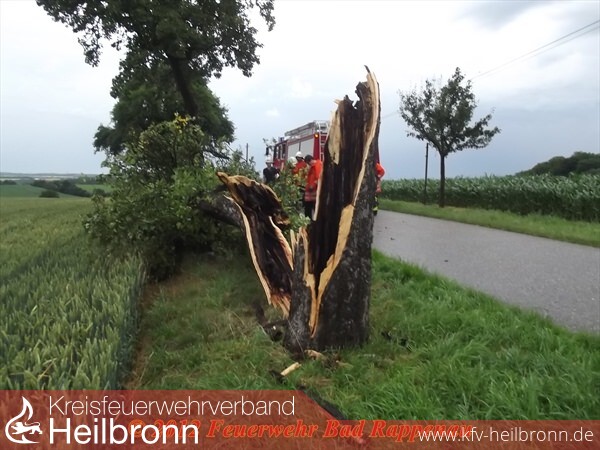 Alarmstichwort an diesem Donnerstagabend lautete: Unwetterlage Grombach Richtung Ehrstädt.Von der Leitstelle wurde ein umgestürzter Baum gemeldet und hat die Abteilungen Grombach und Bad Rappenau alarmiert.
