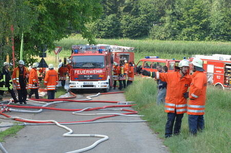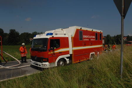 Beim Eintreffen der Feuerwehr brannte eine Maschinenhalle bereits vollständig. Durch die enorme Brandlast in der Halle schlugen die Flammen bis zu 30 Meter hoch aus dem Gebäude. Das Feuer hatte auch schon auf das Wohnhaus der Familie übergegriffen.