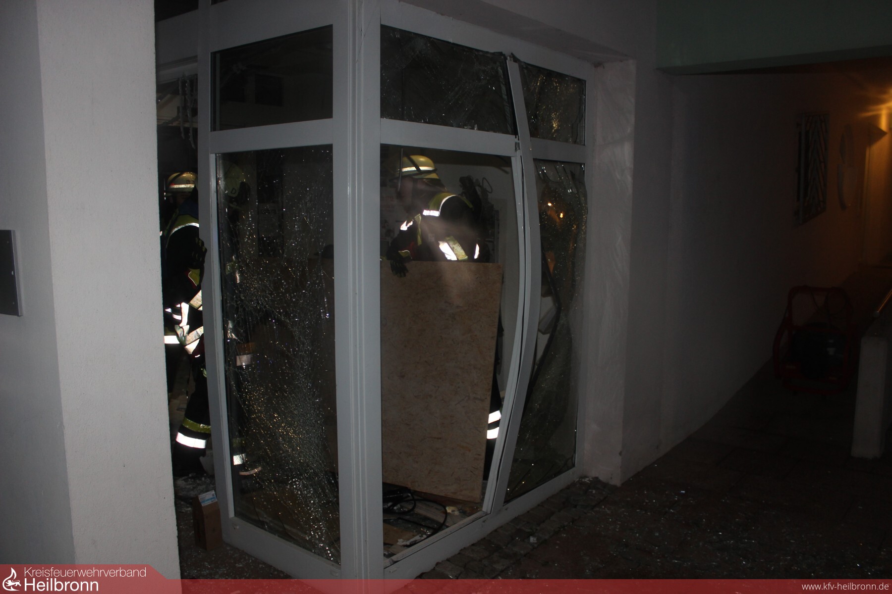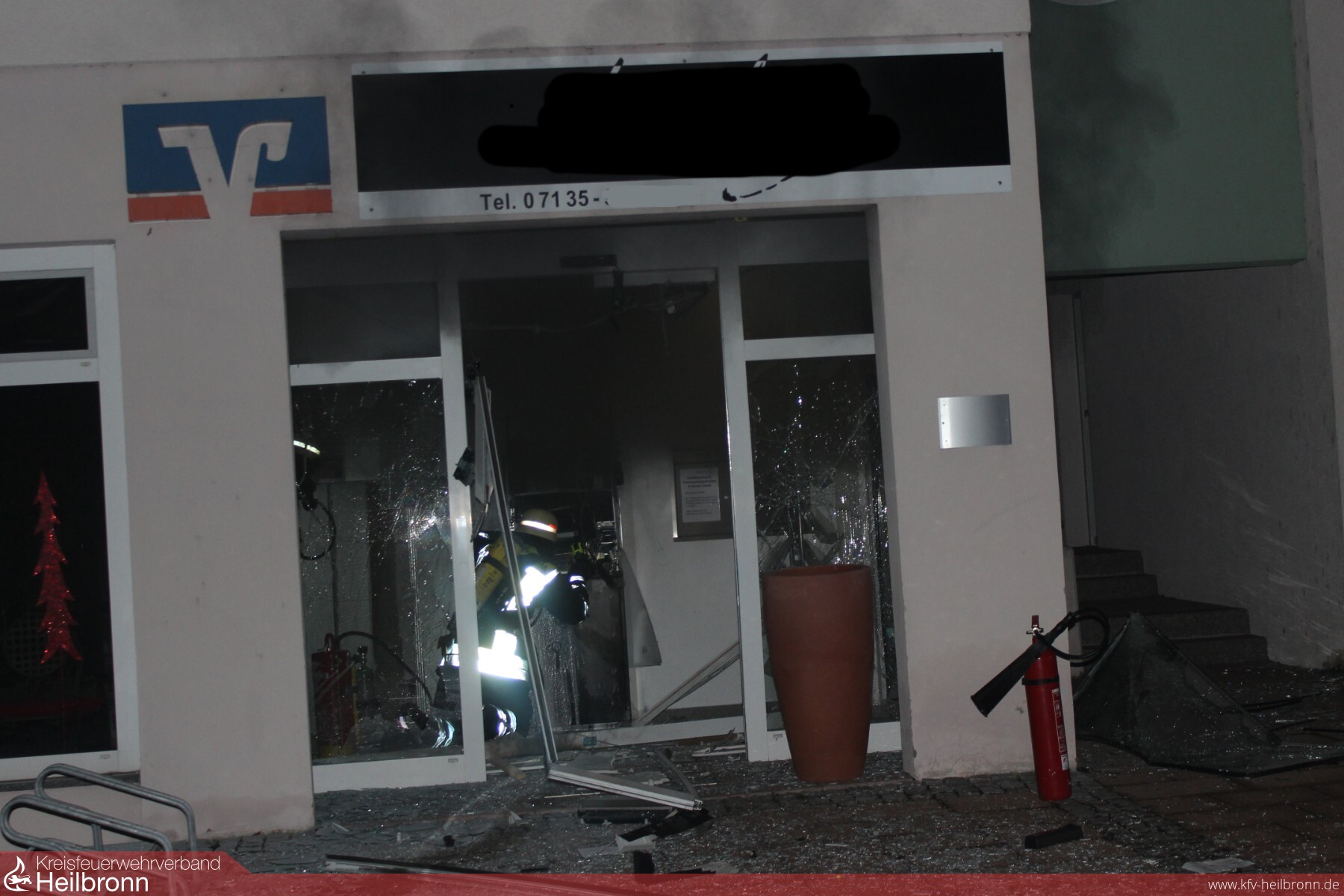 Am Samstag um 3.45 Uhr kam es im Gebäude der Volksbank in Brackenheim-Stockheim zu einer heftigen Verpuffung, durch welche die Scheiben des Raumes eines Geldausgabeautomaten und eines angrenzenden Friseursalons aus ihren Verankerungen gerissen und auf die Straße geschleudert wurden. Die Polizei vermutet, dass Unbekannte ein explosives Gemisch in den Geldausgabeautomaten geleitet haben, um diesen zu sprengen. Nach derzeitigen Erkenntnissen gelang es ihnen aber nicht, dem Bargeld habhaft zu werden. Der angerichtete Sachschaden wird auf über 50.000 Euro geschätzt. Zurzeit sind Spezialisten der Kriminaltechnik vor Ort, um weitere Hinweise über den genauen Geschehensablauf zu erlangen. Mit detaillierten Erkenntnissen ist an diesem Wochenende nicht mehr zu rechnen. Hinweise über verdächtige Wahrnehmungen nimmt die Kriminalpolizei Heilbronn unter der Telefonnummer 07131/104-4444 entgegen.