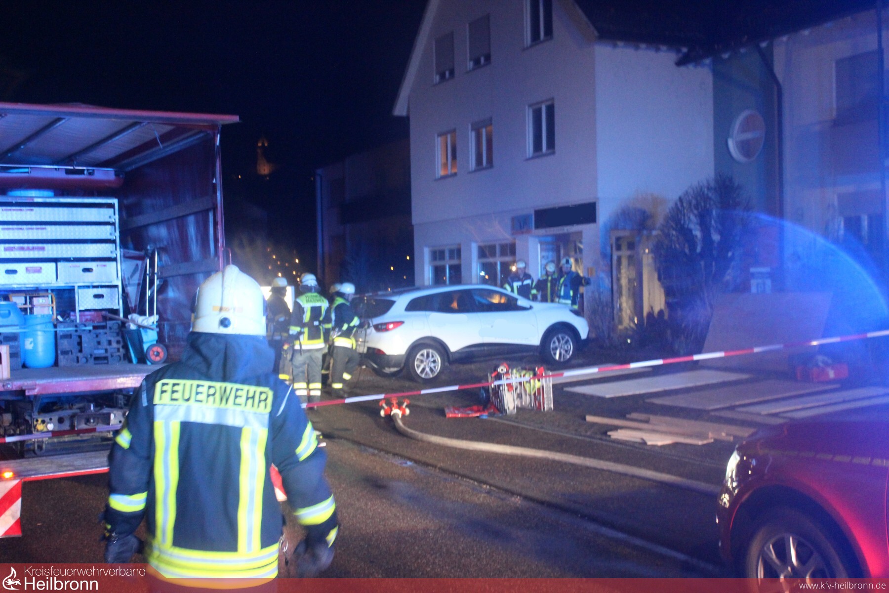 Ein lauter Knall und schreckte in der Nacht von Freitag auf Samstag Anwohner der Deutschordenstraße in Stockheim auf. Ein missglückter Raubversuch an einem Geldautomaten richtete in den Räumlichkeiten der Volksbank und eines im gleichen Gebäude befindlichen Friseursalons einen Sachschaden von mehreren Zehntausend Euro an. Der Automat wurde von einem Trupp mit Kleinlöschgerät abgelöscht und das Gebäude im Anschluss Notverschalt an die Kriminalpolizei übergeben. Im Einsatz waren die Abteilungen Stockheim und Brackenheim.