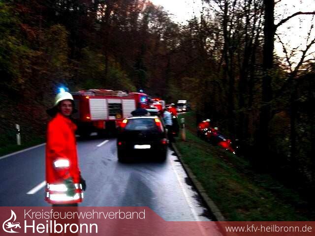 Das Fahrzeug, welches an schwer zugänglicher Stelle ca. 8 Meter tief an der Böschung in Richtung Jagst hing, wurde mit der Winde des RW 2 gesichert. Die Rettung gestaltete sich schwierig, da der Eingeklemmte an der ca. 40° steilen Böschung immer wieder in das Auto zurück rutschte. Ebenso waren die Arbeiten mit Schere und Spreizer an dem rutschigen und glitschigen Hang nicht einfach.