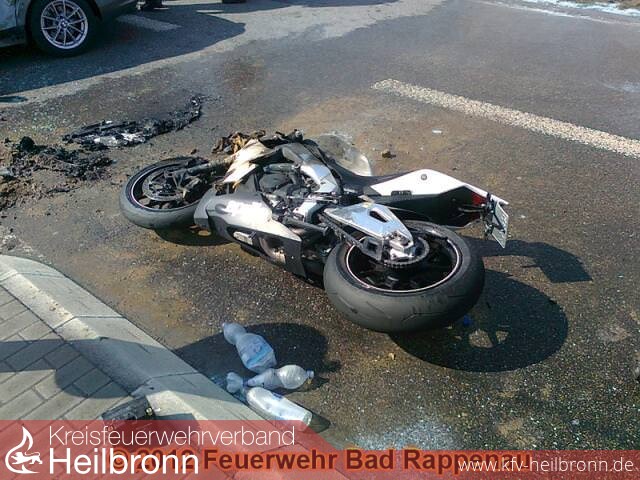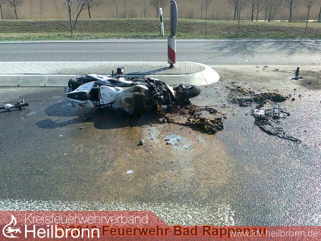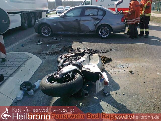 Am Sonntag, dem 25.03.2012, gegen 14.15 Uhr befährt ein 54-jähriger mit seinem Pkw BMW von Bad Rappenau in Richtung Fürfeld. Kurz nachdem er an der Einmündung zum Buchäckerring vorbeigefahren ist, bemerkt er, dass er falsch ist und fährt nach rechts in eine Sackgasse um dann nach einem Fahrbahnteiler zu wenden. Im selben Augenblick, als der BMW quer auf der rechten Fahrbahn stehen bleibt, fährt ein 37-jähriger mit seinem Motorrad Aprilia ordnungsgemäß ebenfalls in Richtung Fürfeld. Das Motorrad fährt auf den stehenden Pkw seitlich frontal auf dessen Fahrerseite auf.