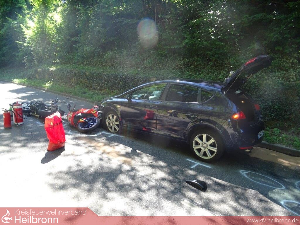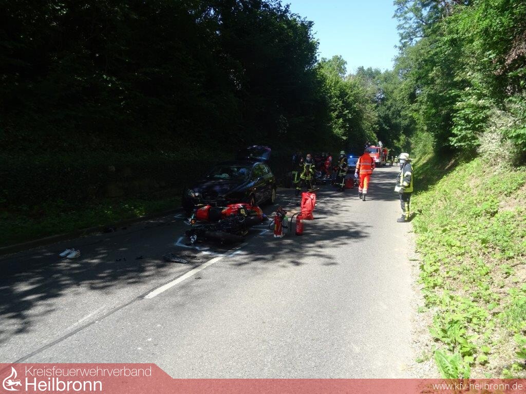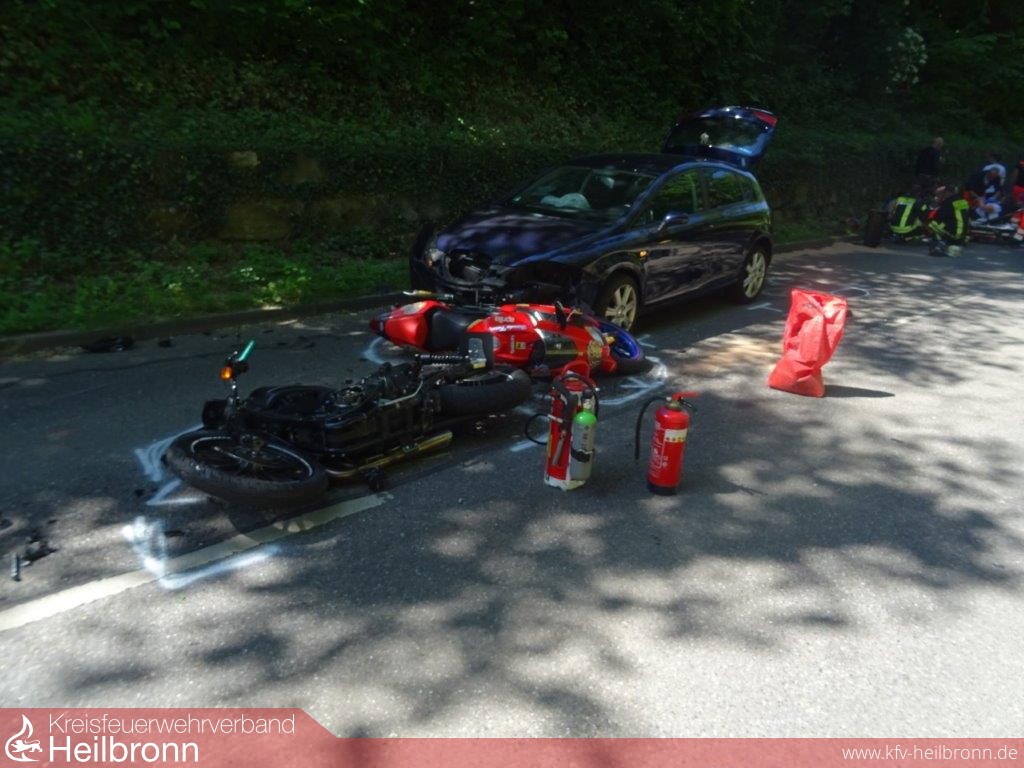 Ein Motorradfahrer ist am Montagabend an der Einmündung der Anschlussstelle Neuenstadt/West in eine Landstraße bei einem Unfall schwer verletzt worden. Der 20-Jährige fuhr gegen 19 Uhr mit seiner Yamaha von Neuenstadt kommend in den Einmündungsbereich ein und kollidierte mit einem von der A 81 kommenden Renault Megane. Die Polizei geht davon aus, dass der junge Fahrer zuvor eine rote Ampel übersehen hat. Die Renault-Fahrerin soll bei Grün auf die Landstraße in Richtung Neuenstadt eingebogen sein. Der Motorradfahrer wurde durch die Kollision auf die Windschutzscheibe geschleudert und prallte von dort auf den Boden. Er erlitt schwere Verletzungen und wurde mit einem Rettungswagen in ein Krankenhaus gebracht. An den Fahrzeugen entstand ein Schaden von etwa 8000 Euro. Sie mussten abgeschleppt werden.