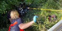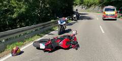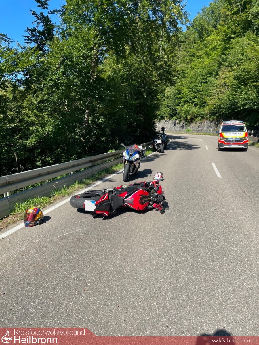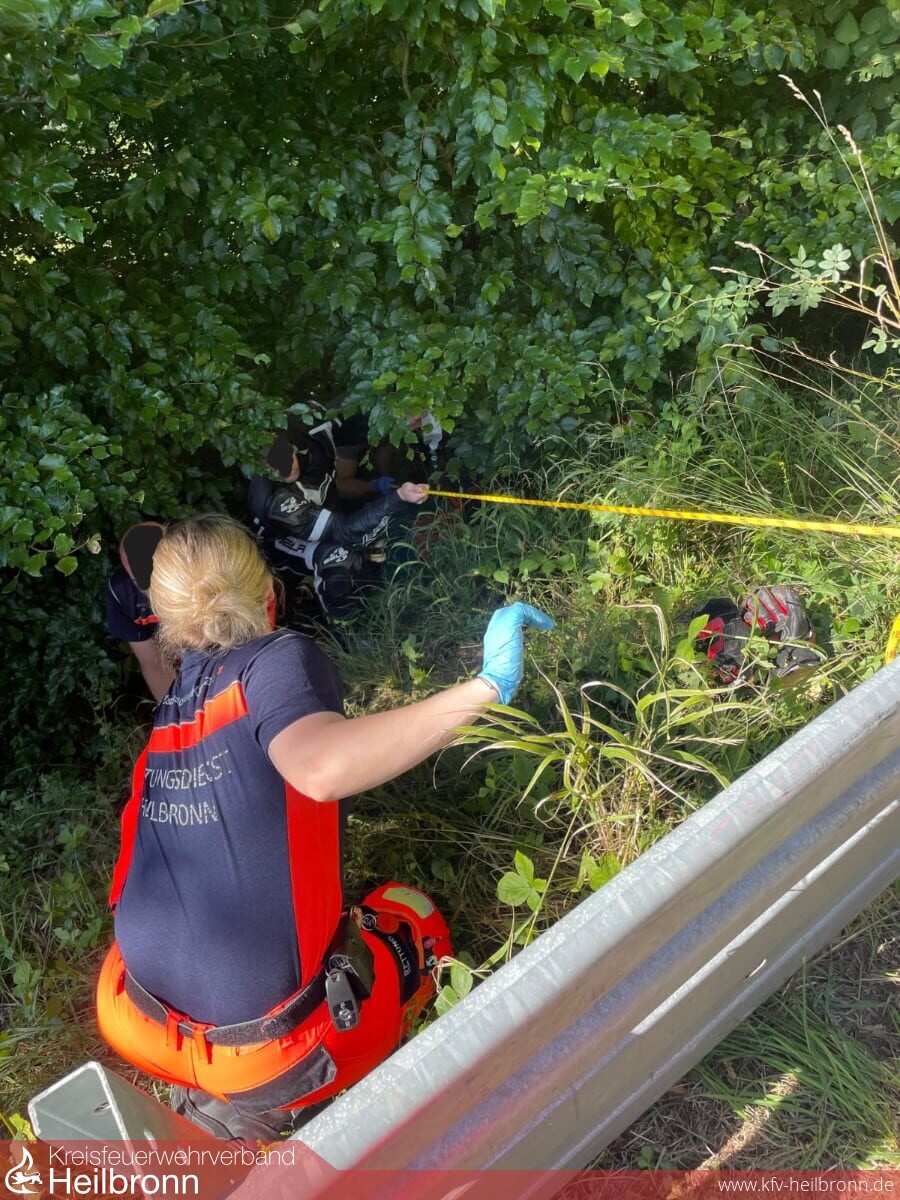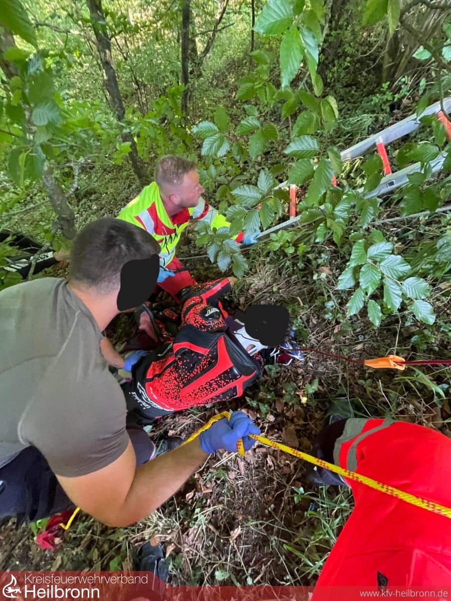 An einer den Rettungskräften gut bekannten Kurve - hier waren schon einige Unfälle - war ein Motorradfahrer bei einem Verkehrsunfall über die Leitplanke und in unwegsamem Gelände einige Meter tief gestürzt.