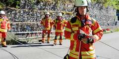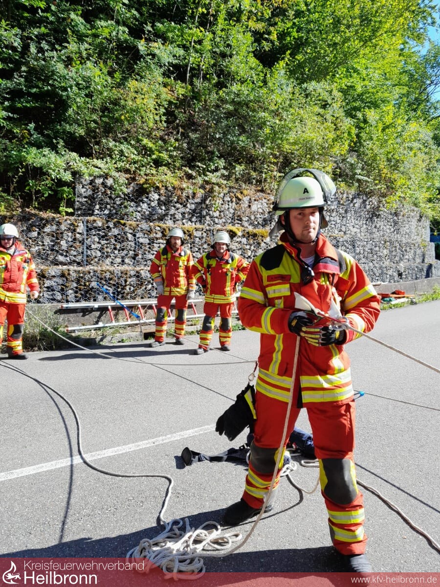 Zuvor waren schon die „Helfer vor Ort“ mit dem Rettungsdienst dort hin alarmiert worden. Nun galt es für die Feuerwehrkräfte, diese Kräfte bei der Rettung zu unterstützen. Dies geschah mit Hilfe einer Leiterrutsche und mehreren Leinen zur Sicherung vom Verunfallten und den Einsatzkräften.