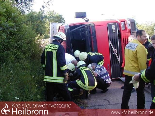 Der deutlich unter Schock stehende Fahrer lag beim Eintreffen der Einsatzkräfte mit mittelschweren Verletzungen im Führerhaus seiner Zugmaschine. Nach der sofortigen Versorgung durch einen Notarzt konnte der Verletzte mittels Spineboard aus seiner misslichen Lage befreit werden.