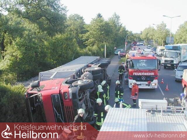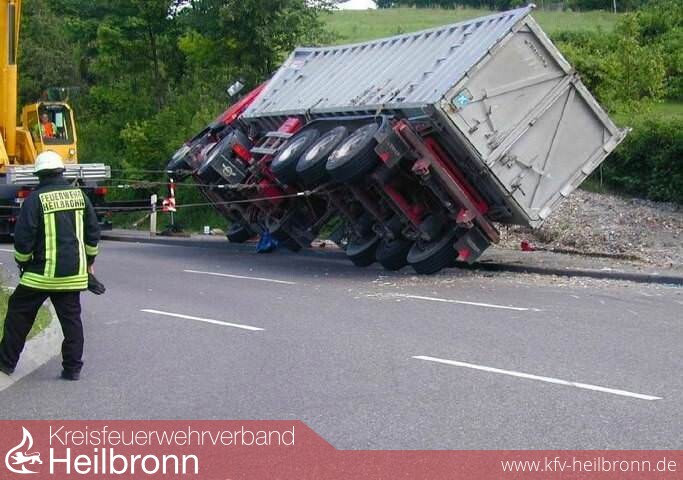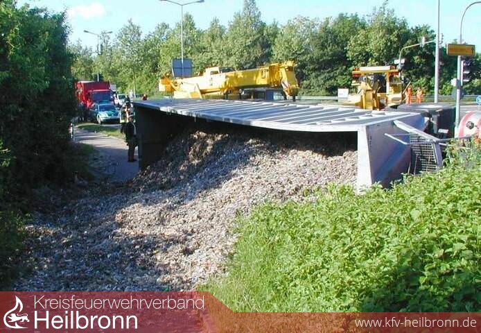 Gegen 07.00 Uhr wollte ein 48-jähriger LKW-Fahrer seinen mit 18 Tonnen geschredderten Müll beladenen Sattelzug von der Karl-Wüst-Straße auf die B 27 steuern. Hierbei unterschätzte er offenbar die Geschwindigkeit mit der er in die Kurve einbog. Das Fahrzeug geriet mit dem rechten Vorderrad an den Randstein und kippte vollständig um. Ein Großteil der Ladung verteilte sich auf dem Randstreifen sowie einem Radweg neben der Fahrbahn.