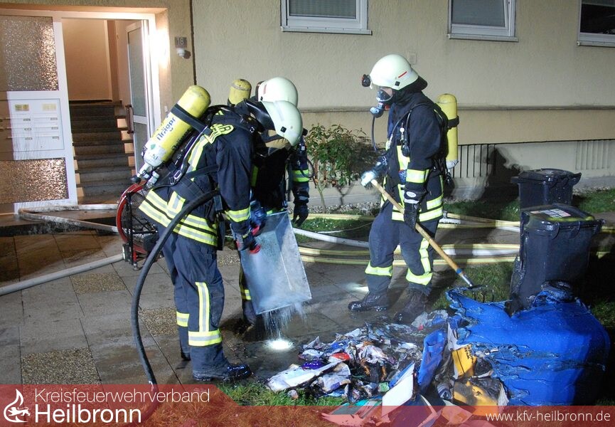 Da der Rauch ins Treppenhaus zog wurde die Drehleiter in Stellung gebracht um bei einer eventuellen Räumung des Hauses die Bewohner der oberen Wohnungen über die Drehleiter retten zu können. Rasch stellte sich aber heraus dass in einem Kellerraum in den Mülltonnen stehen, 3 davon brannten. Die Mülltonnen wurden abgelöscht und ins Freie gebracht.