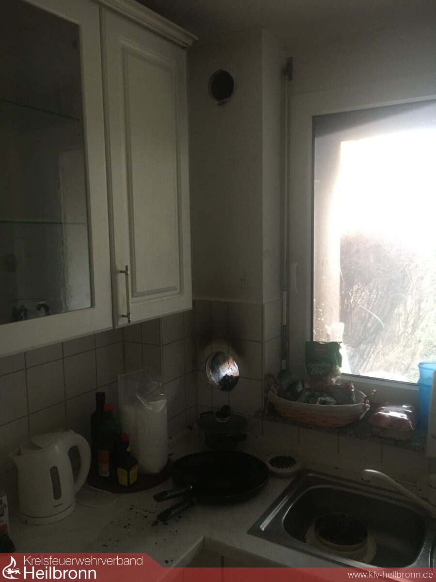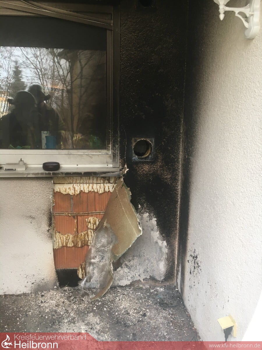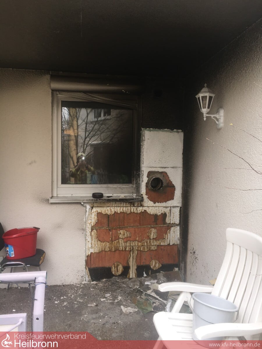 Der Aufmerksamkeit von Nachbarn ist es zu verdanken, dass es in der Villmatstraße zu keinem größeren Brand gekommen war. Gegen 11.22 Uhr bemerkten die Anwohner Flammen auf einer Terrasse im Erdgeschoss des Mehrfamilienhauses und alarmierten die Feuerwehr über den Euronotruf 112. Noch vor dem Eintreffen der Einsatzfahrzeuge vor Ort, hatten die Nachbarn den Brand weitestgehend gelöscht. Die Einsatzkräfte führten Nachlöscharbeiten durch und beseitigten den aus Gartenmöbel und anderen Dingen bestehenden Brandschutt. Der Bereich um das geborstene Fenster wurde mit einer Wärmebildkamera kontrolliert. Zur Verhinderung von Glutnestern musste ein Teil der Vollwärmeschutzverkleidung sowie die Zu- und Abluftdurchführung entfernt werden. Die Küche selbst wurde nur leicht verraucht.