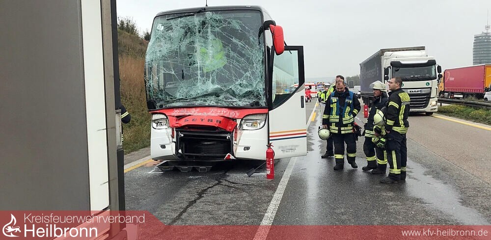 Zu langen Staus kam es am Mittwochmorgen auf der A6 zwischen Bad Rappenau und dem Weinsberger Kreuz in Fahrtrichtung Nürnberg. Der Grund war ein Auffahrunfall im Bereich Neckarsulm. Ein Reisebus war gegen 9.35 Uhr auf einen Lkw am Stauende aufgefahren. Von den insgesamt 31 Businsassen wurden acht Fahrgäste überwiegend leicht und der Busfahrer schwer verletzt. Der Busfahrer musste von der Feuerwehr aus seinem Bus geborgen werden. Er wurde in ein Krankenhaus eingeliefert. Die weiteren Verletzten wurden teilweise zur ambulanten Behandlung in Krankenhäuser gebracht. Die A6 musste zur Unfallaufnahme zunächst voll und später teilweise gesperrt werden. Die verbliebenen Fahrgäste wurden nach Neckarsulm transportiert und dort in den Räumen eines Hotels von Notfallseelsorgern betreut. Der Lkw wurde nur leicht beschädigt und konnte nach der Unfallaufnahme weiterfahren. Der Bus musste mit einem Schaden von circa 20.000 Euro abgeschleppt werden.