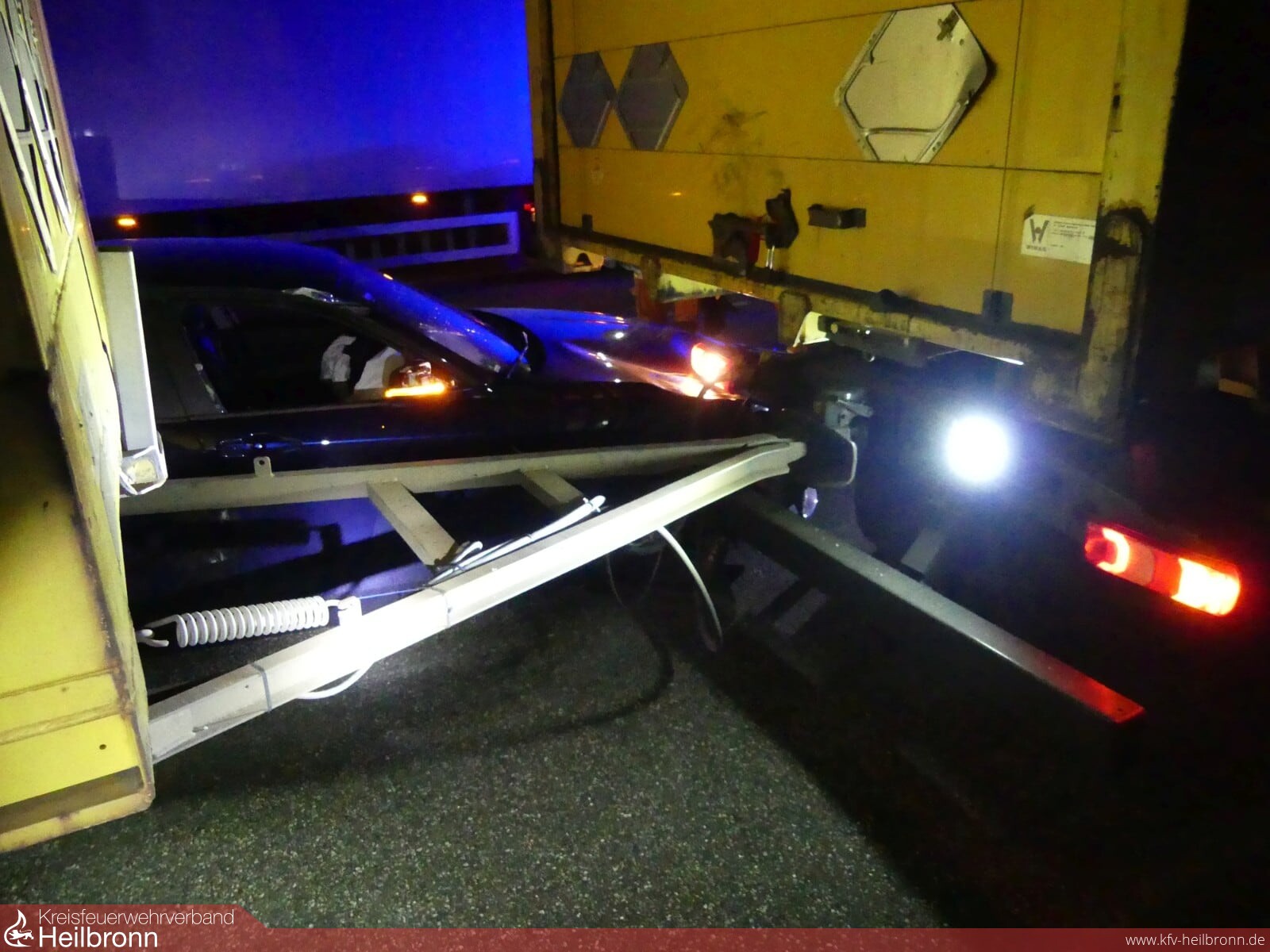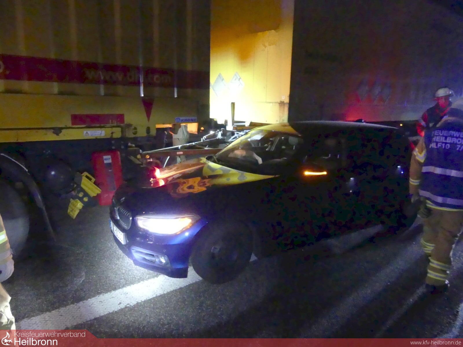 Um 23.10 Uhr wurde die Feuerwehr Heilbronn zu einem Unfall zwischen einem Pkw und einem Lkw auf die Autobahn 6 zwischen Bad Rappenau und der Anschlussstelle Untereisesheim gerufen.
