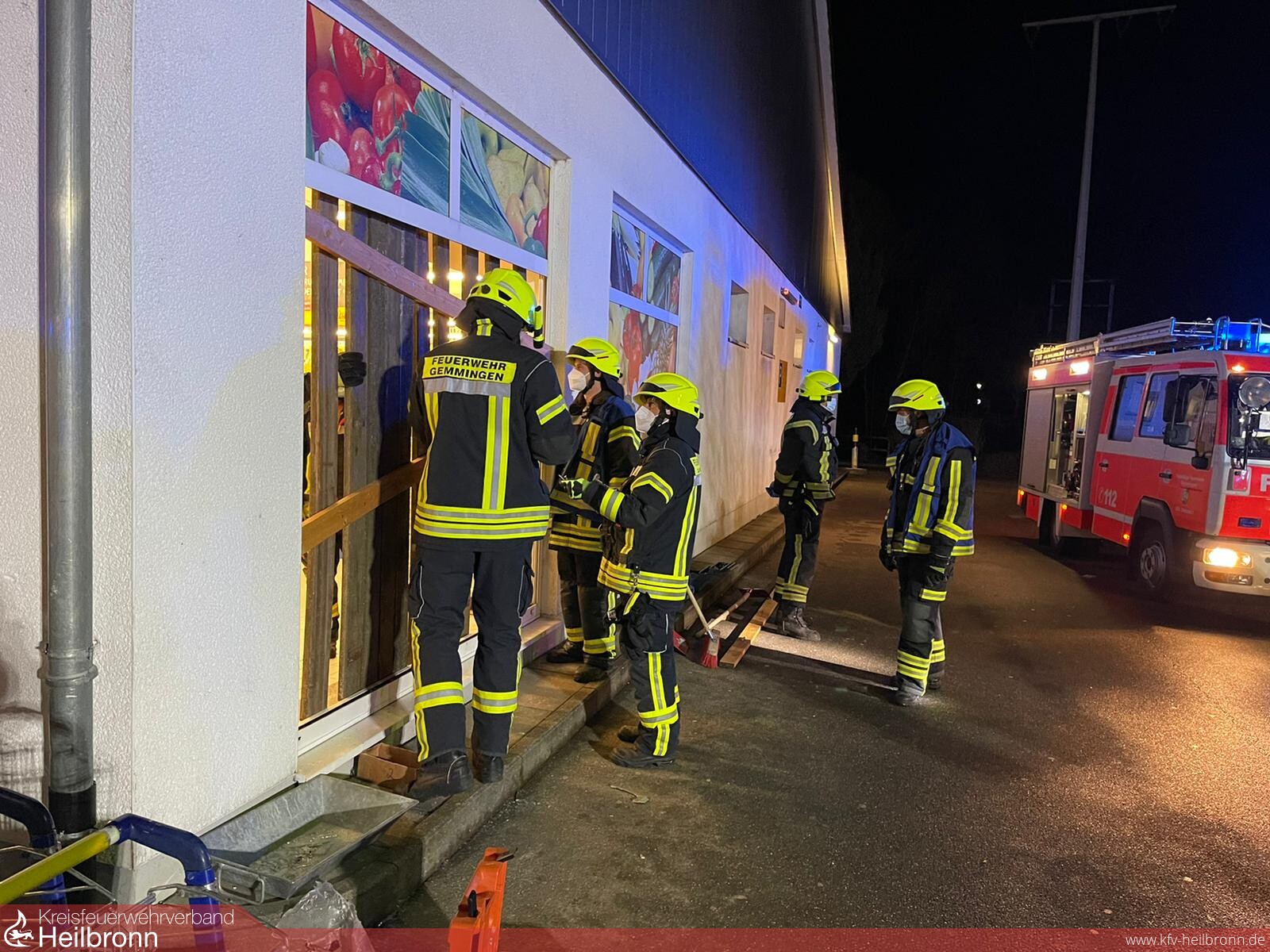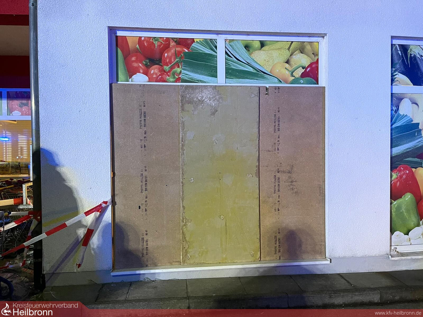 Beim Eintreffen an der Örtlichkeit konnte erkannt werden, dass die Glasscheibe eines Lebensmittel-Discounters durch Sachbeschädigung zerstört wurde. Im Zuge dessen wurde die Feuerwehr durch die Polizei mit der vorübergehenden Verschließung der Glasscheibe zur Wahrung der Besitzverhältnisse beauftragt. Deshalb wurde durch Holzbalken- und brettern des Gemeindebauhofs eine sogenannte Notverschalung errichtet.