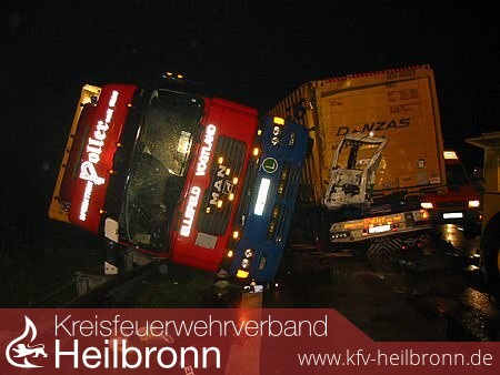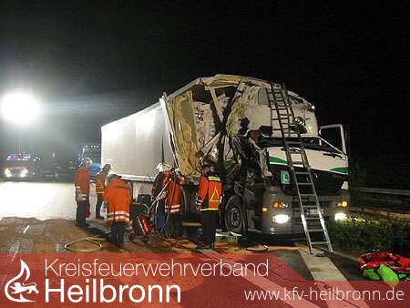 Nach der Anschlussstelle Untereisesheim kam es zu einem Auffahrunfall zwischen einem liegengebliebenen Lastzug und einem Sattelzug. Durch die Wucht des Aufpralls wurde die Zugmaschine des Lastzuges umgeworfen und an dem Sattelzug, welcher auf die linke Richtungsfahrbahn schleuderte, der Kraftstofftank aufgerissen.