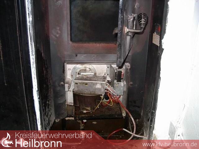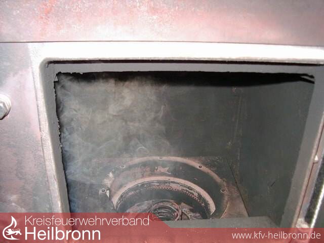Der Ofen brannte im kompletten Brennraum völlig unkontrolliert, wobei es immer wieder zu Verpuffungen kam. Die Ölzufuhr und der elektrische Hauptschalter wurden abgestellt, der Ofen brannte vollends kontrolliert aus.
