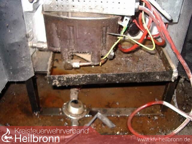 Das Auffangblech am Boden war randvoll mit dem bereits ausgelaufenen Heizöl. Großes Glück hatten hier die Bewohner, dass kein brennendes Öl aus dem Brennraum in diese Wanne tropfte.