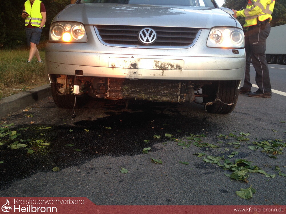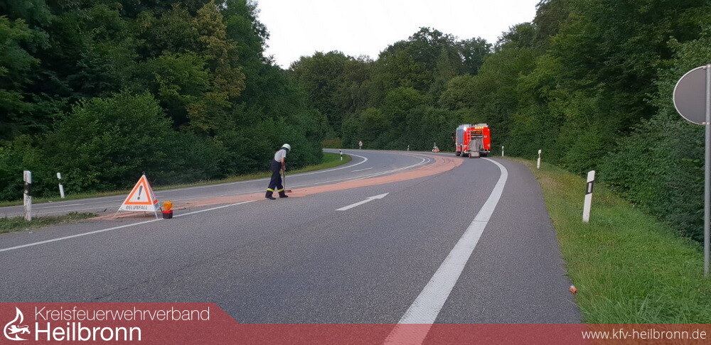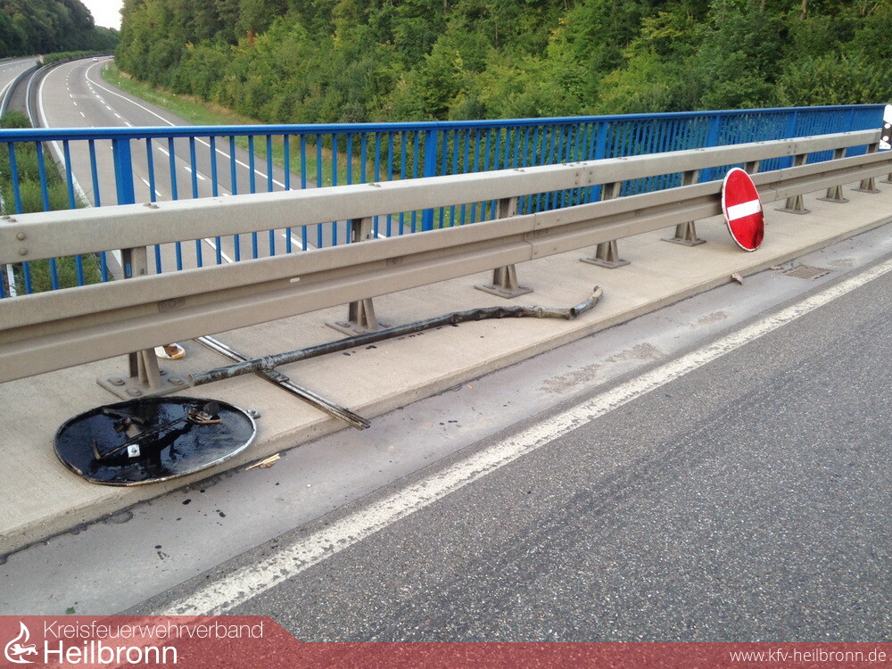 Zur Beseitigung einer Ölspur, nach einem Verkehrsunfall, wurde die Abteilung Möckmühl an die Auffahrt zur BAB 81, in Fahrtrichtung Würzburg, gerufen. Ein Verkehrsteilnehmer wollte mit seinem VW Tiguan die BAB verlassen und kam dabei von der Fahrbahn, schlingerte an einer Hecke entlang, kollidierte danach mit dem Verkehrszeichen zur Ein- und Ausfahrt, welche sich unter dem PKW verkeilten und die Ölwanne massiv beschädigten. Bei seiner Weiterfahrt verlor der Mann diese Teile samt Haltepfosten auf der Brücke der L1095, welche über die BAB führt. 200 Meter weiter war dann an einer Haltebucht Ende der Fahrt. Die Feuerwehr nahm die auslaufenden Betriebsmittel an der BAB sowie in der Haltebucht auf, reinigte die Fahrbahn und beseitigte die Hindernisse auf der Straße.