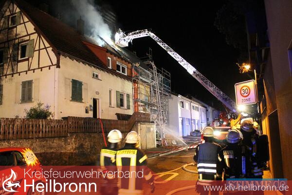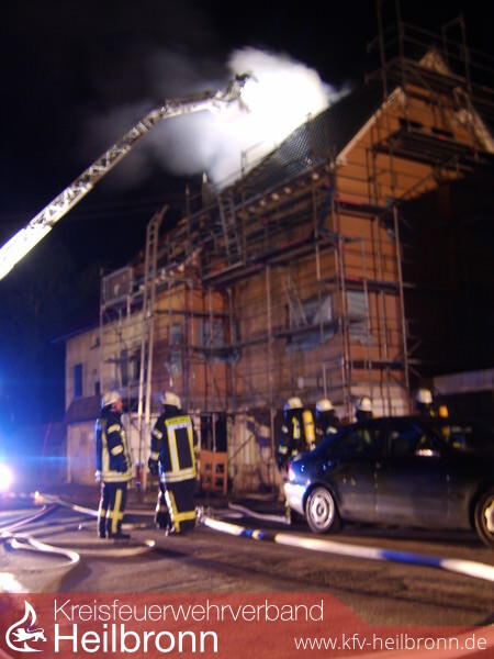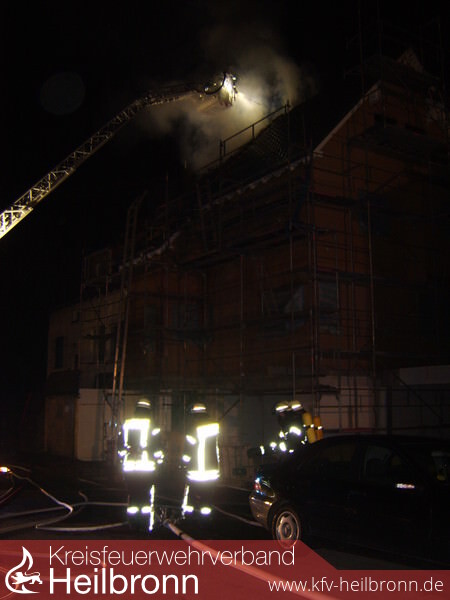 Vor Ort brannte der Dachstuhl eines noch im Bau befindlichen Gebäudes. Personen waren entgegen der ursprünglichen Meldung keine mehr in Gefahr. Mittels Riegelstellungen wurde ein Übergreifen auf das direkt angebaute und bewohnte Wohnhaus verhindert. Über mehrere Rohre im Innenangriff sowie die Lauffener Drehleiter wurde das offene Feuer bekämpft. Eine weitere Drehleiter zur Brandbekämpfung wurde nachgefordert. Die Feuerwehr Heilbronn übernahm nach Eintreffen daraufhin einen rückwärtigen Angriff. Im Innenangriff wurde permanent brennende Isolierung abgelöscht.