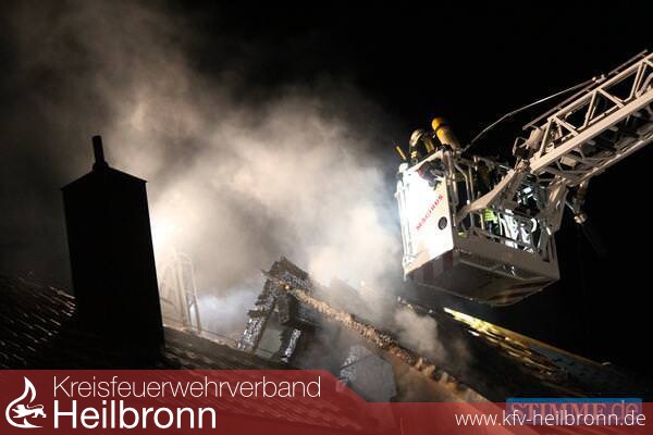 Der 30-jährige Bauherr war am Dienstag, bis in die Abendstunden damit beschäftigt, Bitumen Schweißbahnen auf der Terrasse zu verlegen. Vermutlich durch Funkenflug entzündete sich, für den Hausherrn unbemerkt, im Laufe der Nacht die westliche Gebäudeseite des mit Holzfaserplatten isolierten Neubaus in Holzständerbauweise. Das Feuer fraß sich an der Wandverkleidung nach oben bis in den bereits eingedeckten Dachstuhl. Da der Neubau direkt an ein älteres Gebäude anschloss, wurde auch dessen Dachstuhl in Mitleidenschaft gezogen. Die Feuerwehren aus Nordheim, Lauffen und die Berufsfeuerwehr Heilbronn waren mit insgesamt 77 Mann im Einsatz. Ein Übergreifen auf das direkt anschließende Nachbargebäude konnte verhindert werden. Die Schwägerin verließ mit ihrem Kind rechtzeitig das Haus. Sie kam bei Verwandten unter.