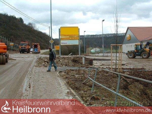 Noch vor dem Ausrücken des TLF wurde über Handy mitgeteilt, dass der Bahnübergang in Siglingen sowie die Verbindungsstraße Neudenau-Siglingen-Züttlingen komplett unter Wasser standen bzw. mit Schlamm-Geröll überflutet waren. So entschied die Mannschaft vor Ort, sich direkt aufzuteilen: TLF rückt aus zur Tankstelle / Siglinger Straße, der Gerätewagen (GW) sollte sich ein Bild der Lage in Siglingen machen. Doch bereits an der Tankstelle in Neudenau mussten sich beide Fahrzeugbesatzungen umentscheiden, da ein Durchkommen nach Siglingen hier nicht möglich war... ein Fluss aus Regenwasser und Schlamm bahnte sich seinen Weg über die Fahrbahn auf etwa 50 Metern Breite.