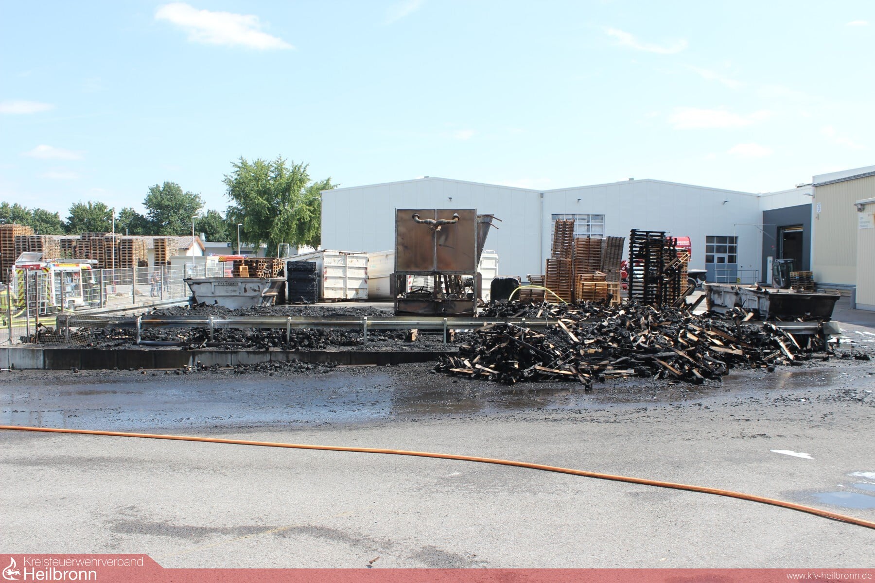 Durch den schnellen Einsatz von mehreren Rohren zur Brandbekämpfung und Riegelstellungen konnte ein Übergreifen der Flammen auf die Produktions- und Lagergebäude der betroffenen Firma knapp verhindert werden. Lediglich ein auf dem Hof stehender Kartonagencontainer mit Presse fing durch die enorme Wärmestrahlung Feuer und musste mit einem Schaumangriff abgelöscht werden. Wie enorm die Wärmestrahlung war zeigen die Beschädigungen an den Hallen und sogar bei einer benachbarten Firma auf der gegenüberliegenden Straßenseite. Dort wurden unter anderem an einem LKW und mehreren PKW Kunststoffteile enorm beschädigt. Neben den Paletten wurde auf einer Rampe stehendes fertiges Material teilweise und eine alte Maschine komplett beschädigt. Von dieser Maschine ging nach Angaben der Polizei auch bei Schweißarbeiten durch eine Fremdfirma der Brand aus.