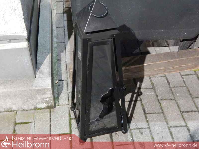 Die Feuerwehr schaffte sich Zugang mit Hilfe von Türöffnungswerkzeug und kontrollierte den Innenbereich mit einer Wärmebildkamera. Schnell konnten eine auf dem Boden stehende Laterne als Ursache ausfindig gemacht werden. Durch die bereits geborstenen Scheiben der Laterne züngelten kleine Flammen mit starker Rauch- und Rußentwicklung.