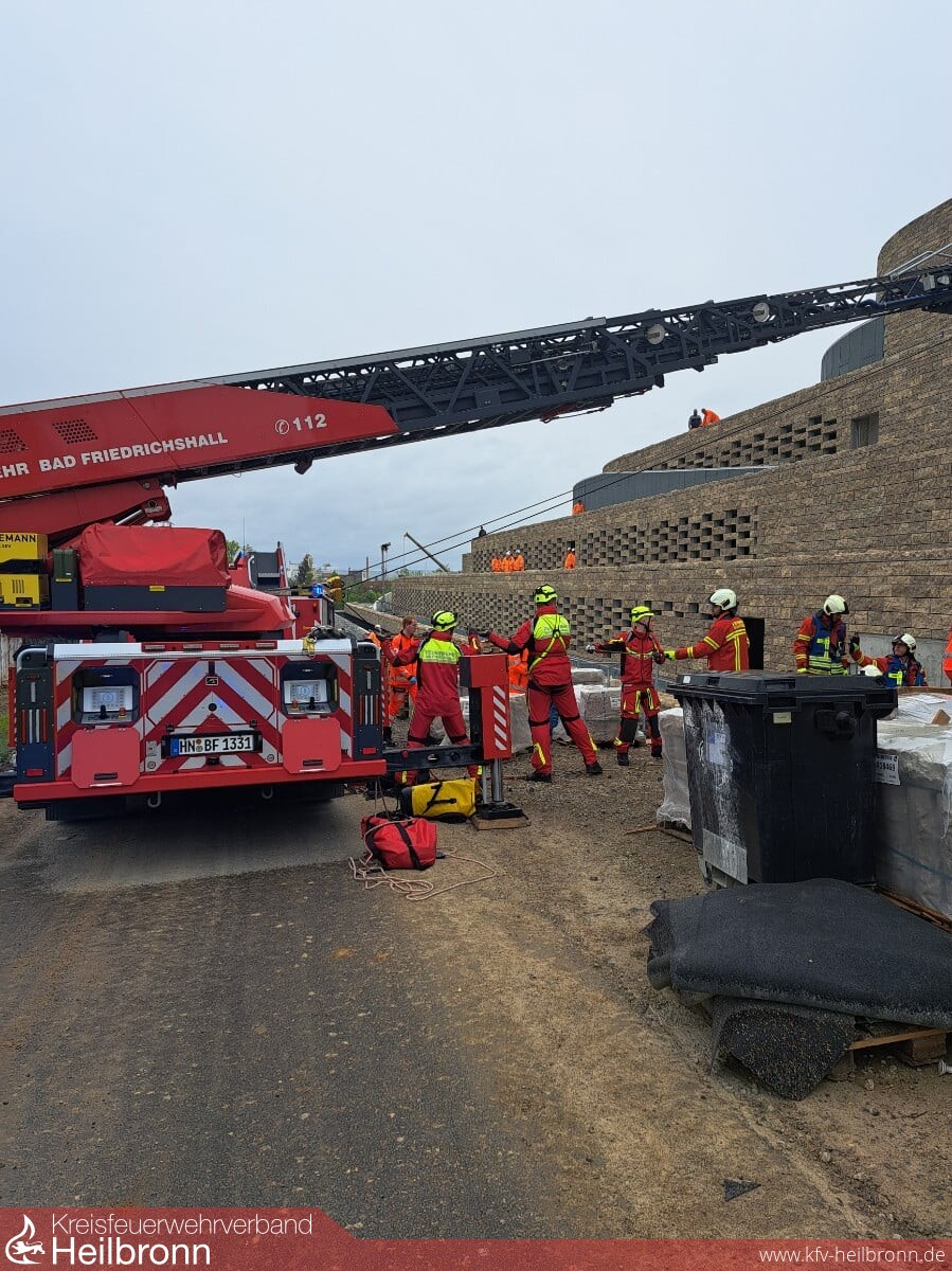 Um 15:18 Uhr wurden Feuerwehr und Rettungsdienst zu einem Arbeitsunfall auf eine Bad Friedrichshaller Großbaustelle alarmiert. Dort war ein Arbeiter ca. 8 Meter in einen Schacht in die Tiefe gestürzt. Der schwerverletzte Mann wurde vom Notarzt und Rettungsdienst transportfähig auf eine Vakuummatratze gelagert und medizinisch versorgt. Von der Feuerwehr wurde eine Rettung aus dem Schacht mit der Drehleiter, einem Flaschenzug inklusive redundanter Sicherung und Schleifkorbtrage durchgeführt. Hierbei kam auch die Fachgruppe ERHTWE (Einfach Rettung aus Höhen und Tiefen, Wasser und Eis) zum Einsatz. Mit einem Mannschaftstransportwagen wurde das Personal das Rettungshubschraubers, welcher in rund 300 Meter Entfernung zur Einsatzstelle gelandet war, abgeholt und zur Einsatzstelle transportiert. 30 Minuten nach Alarmierung der Rettungskräfte, konnte der Patient ins Klinikum Am Plattenwald zur weiteren Versorgung gebracht werden. Vorbildlich erfolgte die Einweisung und Koordination der Rettungskräfte durch den Baustellenlogistiker, dies führte letztlich dazu, dass keine wertvolle Zeit verloren ging.
