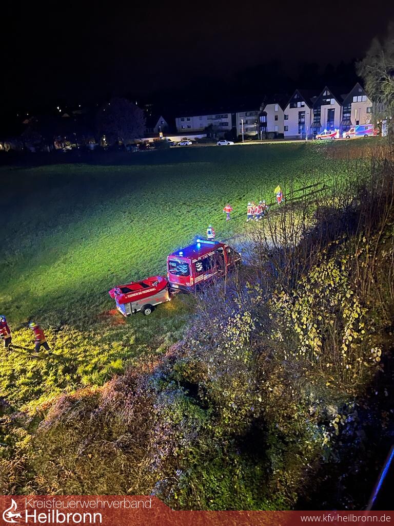 Um 05:57 Uhr wurden alle drei Einsatzabteilungen der Feuerwehr Bad Friedrichshall zu einer Wasserrettung alarmiert. Von Passanten wurde von der Kocherbrücke aus eine Person im Wasser gesichtet und Wimmern wahrgenommen. Die beiden jungen Männer eilten umgehend ans Ufer des Kochers und stiegen selbstlos in das eiskalte Wasser um den Mann zu retten. Leider war die Böschung zu hoch, so dass sie den Mann nicht aus dem Wasser bekamen. Eine weitere Passantin alarmierte während dessen die Rettungskräfte über den Notruf 112. Vom Einsatzleiter wurden die Rettungskräfte umgehend an das Kocherufer geschickt. Innerhalb von wenigen Minuten, konnte die Person durch die Feuerwehr an Land gebracht und dem Rettungsdienst übergeben werden. Gelagert auf einer Schleifkorbtrage wurde der stark unterkühlte, aber glücklicherweise noch ansprechbare Patient über eine Wiese zum Rettungswagen getragen. Parallel zu der Rettung wurde die Einsatzstelle großflächig ausgeleuchtet. Die anrückenden Rettungstaucher der Feuerwehr Heilbronn sowie des DLRG konnte die Einsatzfahrt abbrechen.