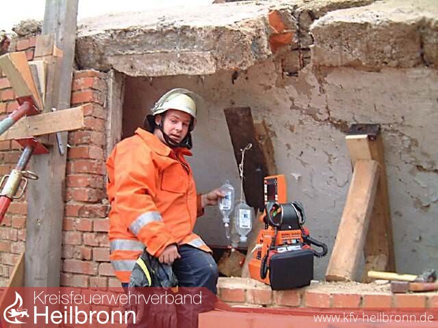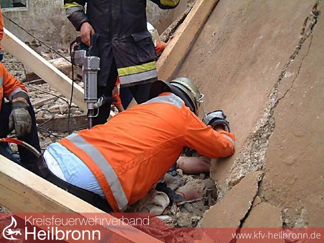 Parallel wurde damit begonnen, umfangreiche Sicherungsarbeiten durchzuführen, um weitere Einstürze möglichst auszuschließen. Zur Unterstützung wurde ein Baustatiker, der innerhalb kürzester Zeit am Einsatzort eintraf, hinzugezogen. Dieser stand mit seinem Rat bis zur endgültigen Befreiung des Verunglückten zur Verfügung stand. Nach ca. 1 Stunde waren diese Sicherungsmaßnahmen soweit abgeschlossen, dass mit den eigentlichen Befreiungsmaßnahmen begonnen werden konnte. Mit einem Bohrhammer wurde begonnen, Stück für Stück den Beton um den eingeklemmten herum zu entfernen. Immer wieder wurden auch freigelegte Armiereisen mit einer Rettungsschere abgeschnitten. Bei dem äußerst sorgfältigen Arbeiten war der Freiraum nach einer weiteren halben Stunde dann so groß, dass der schwer Verletzte befreit und dem Rettungsdienst übergeben werden konnte.