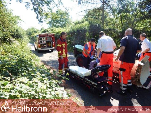 An der Einsatzstelle hatte ein Schmalspurschlepper einen Achsbruch erlitten und das linke Hinterrad verloren. Als der Traktor auf die Seite kippte, klemmte sich der Fahrer den rechten Fuß am Lenkgestänge ein. Da es hierbei zu einer Verdrehung des Fußes kam, zog sich der Fahrer eine offene Fraktur zu.