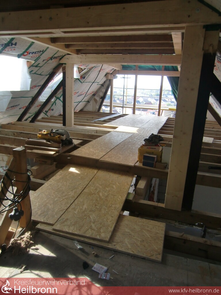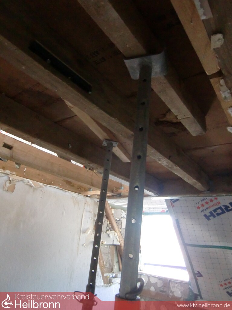 In einem entkernten Dachgeschoss musste die verletzte Person über die offene Balkendecke von einer Giebelseite zur anderen Giebelseite verbracht werden, um dort per Drehleiter gerettet werden zu können. Dies geschah über einen, von Kräften der Wehr, provisorisch eingezogenen Boden aus OSB-Platten, in doppelter Breite. Zuvor wurde der Liegeplatz zur Erstversorgung der Person von unten durch Bausprieße abgesichert, da an der Restfläche der Decke bereits Abrissarbeiten durchgeführt wurden.