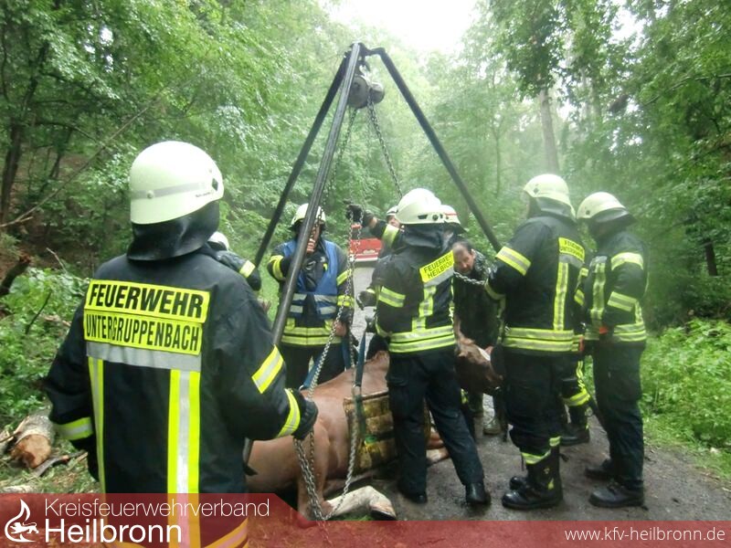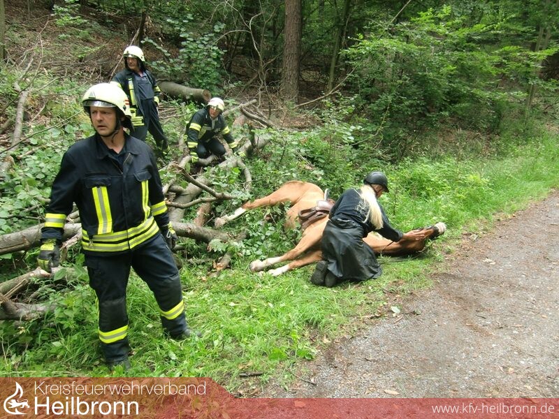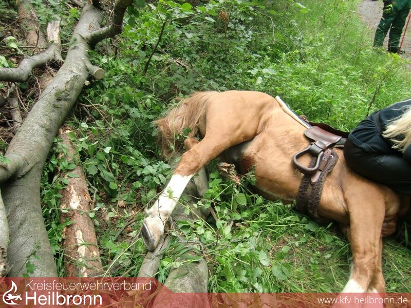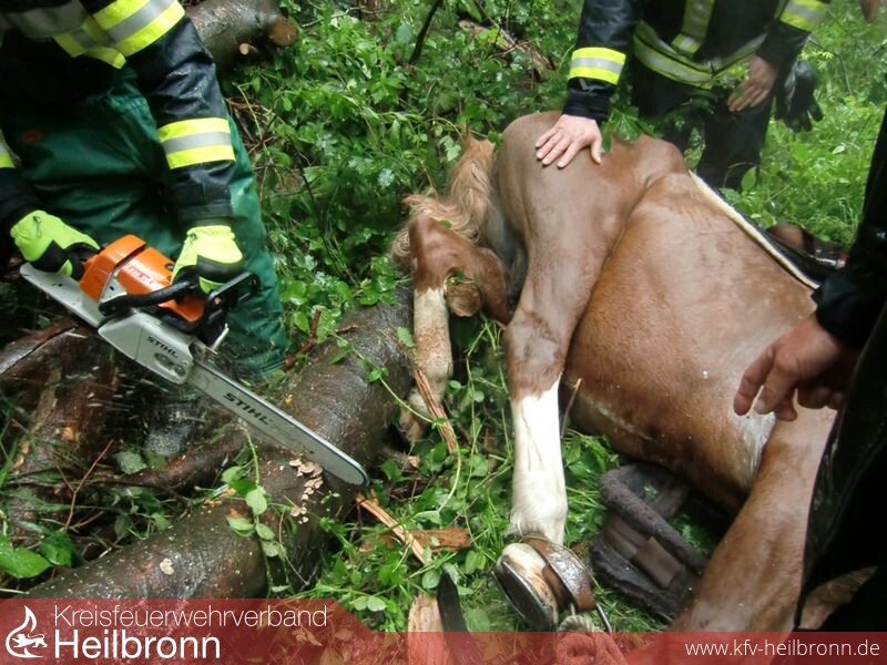 An der Einsatzstelle bot sich den Kräften folgendes Bild. Ein Pferd war im unbefestigten Gelände an einem Abhang zu einem Waldweg gestürzt, so dass es sich mit der linken Hinterhand so unglücklich zwischen dort lagernden Baumstämmen verklemmte und sich aus eigener Kraft nicht mehr befreien konnte. Weiter hatte das Pferd einige kleinere Verletzungen erlitten. Die Erstmaßnahmen galten der Sicherung des Baumstammes und der Beruhigung und Fixierung des Pferdes. Von der Einsatzleitung wurde ein Veterinär und Spezialgerät von der BF Heilbronn zur Einsatzstelle nachgefordert. Bis zum Eintreffen eines Spezialisten wurde das Pferd unter großer Mühe in seiner misslichen Lage fixiert, da bei weiteren Bewegungen ein sehr großes Risiko für weitere folgenschwere Verletzungen bestanden hätte. Nach der Sedierung durch den Tierarzt konnte das Pferd zunächst mittels Handsäge und Kettensäge befreit werden. Aufgrund der langen Liegezeit und der erlittenen Verletzungen konnte das Pferd jedoch nicht mehr aus eingener Kraft aufstehen, so dass dieses mittels Spezialgerät der BF HN aufgerichtet und anschließend in einen Pferdehänger verbracht werden musste.