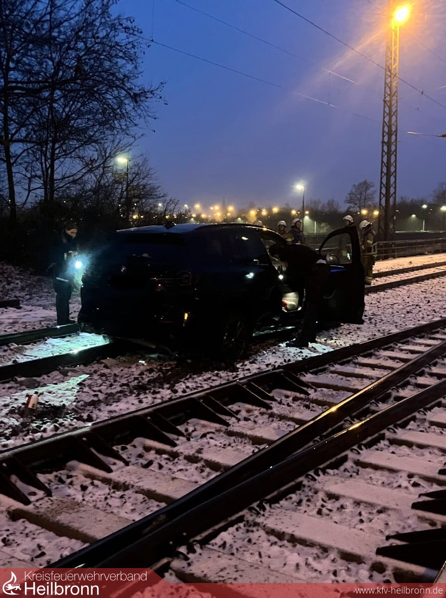 Kaum hat das neue Jahr begonnen, geht es auch schon wieder kurios mit den Einsätzen weiter. Heute Morgen gegen 07.31 Uhr meldete eine Person über den Notruf bei der Leitstelle für Feuerwehr und Rettungsdienst, dass sie mit ihrem Wagen stecken geblieben wäre. Bei der Beschreibung des Standortes traute der Disponent seinen Ohren nicht, denn der Wagen befand sich tatsächlich in den Gleisen der Eisenbahnbrücke über der Theresienwiese. Bei der Rekonstruktion der Fahrstrecke stellte sich heraus, dass die Irrfahrt in der Bahnhofstraße, Höhe Olgastraße, auf den Stadtbahnschienen begann. Diese führte dann am Bahnhof vorbei auf den Gleisen der Deutschen Bahn (DB) bis zur Brücke. Hierbei fielen einige bahntechnischen Einrichtungen zum Opfer, was für das Fahrzeug vorerst keine wirklichen Probleme darstellten. Erst als es wirklich nicht mehr weiter ging, wurde Hilfe angefordert. Die Feuerwehr ließ die Strecke sperren und versorgte die Person. Das Fahrzeug wurde von einem Arbeitstrupp der DB geborgen. Warum der BMW dort überhaupt unterwegs war, ist Sache der polizeilichen Ermittlungen.