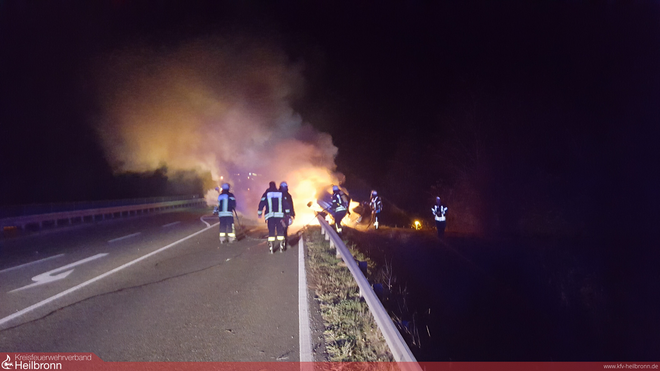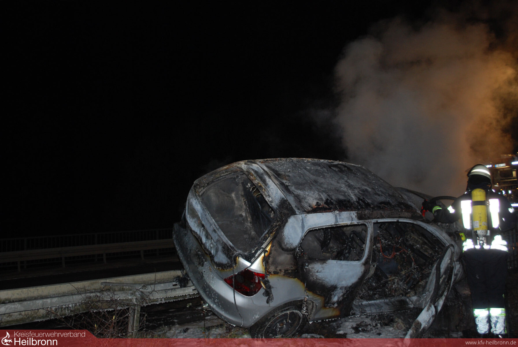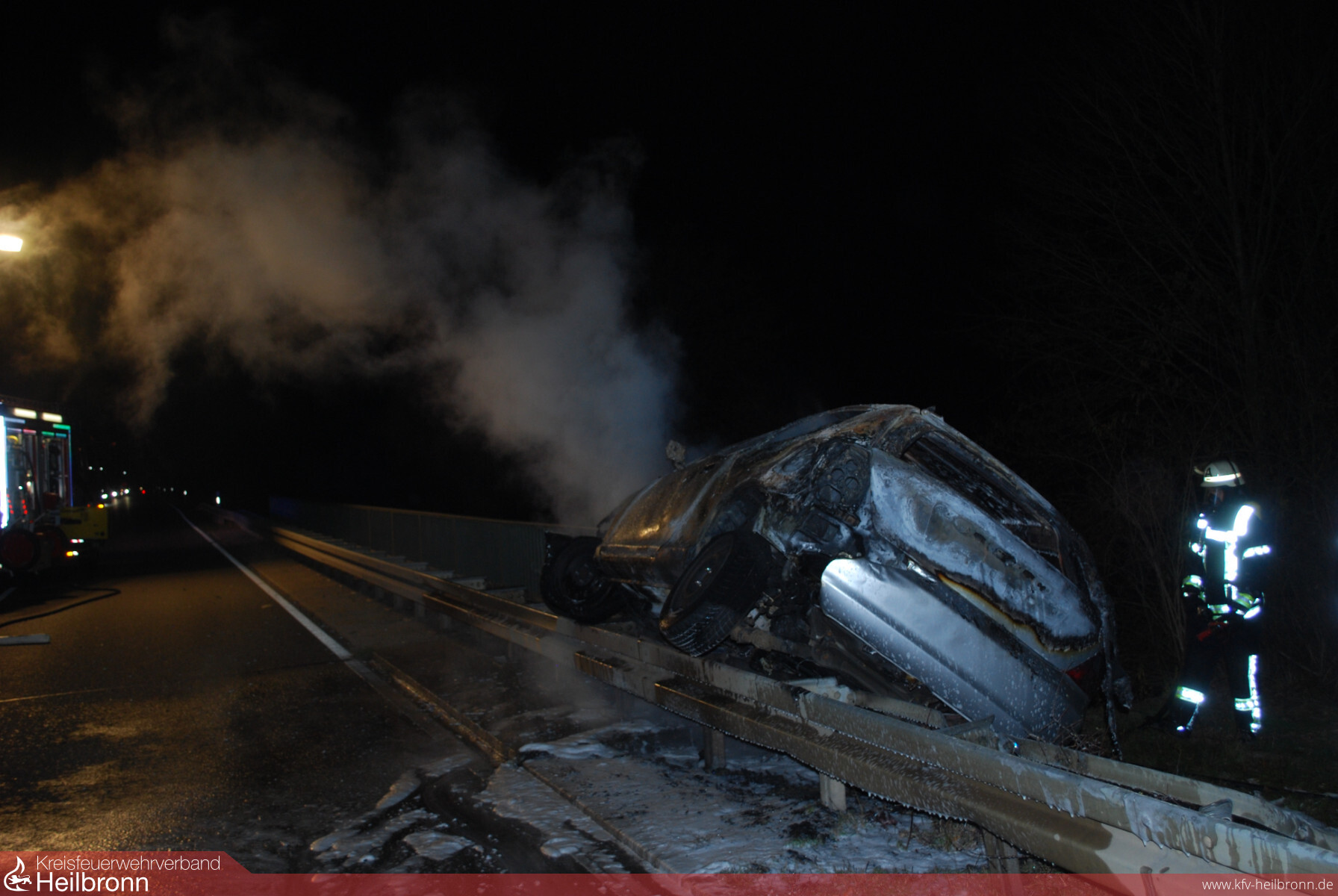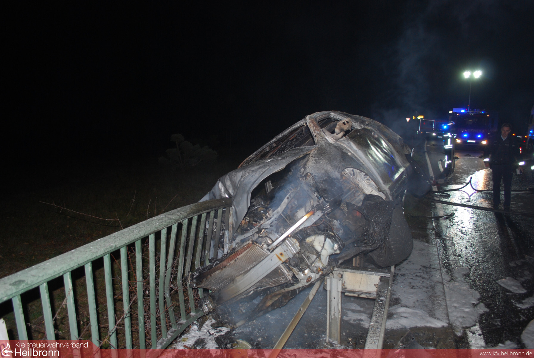 In Höhe der Auffahrt beim Freibad brannte ein PKW in voller Ausdehnung. Ersthelfer konnten dem Fahrer noch rechtzeitig aus dem Fahrzeug helfen. Das Fahrzeug war kurz vor einer Brücke auf die beginnende Leitplanke aufgefahren und kam erst mit dem Aufprall auf das Brückengeländer zum stehen.