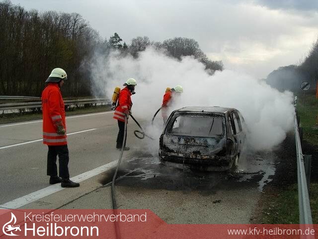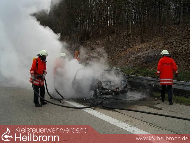 Gegen 18.15 Uhr wurde die FF Möckmühl zu einem PKW-Brand auf der A81, Km 507, gerufen. Da mehrere Anrufe bei verschiedenen Leitstellen eingingen, stellte sich erst auf der Anfahrt heraus, dass der brennende PKW in Fahrtrichtung Stuttgartsteht und nicht wie zuerst gemeldet, Richtung Würzburg. Das TLF 16/25 der Möckmühler Wehr fuhr durch,wendete an der Ausfahrt Osterburken und setzte seine Fahrt zur Einsatzstelle fort. Von hinzu gekommenen Helfern unternommene Löschversuche schlugen fehl und der PKW stand beim Eintreffen in Vollbrand. Ebenso hatte das Feuer schon leicht auf eine angrenzende Böschung übergegriffen. Diese wurde von der Autobahnpolizei abgelöscht. Die FF möckmühl löschte den PKW unter Atemschutz, mit einem C-Rohr ab und benässte anschließend die Böschung, um ein weiter brennen, der selbigen zu verhindern.