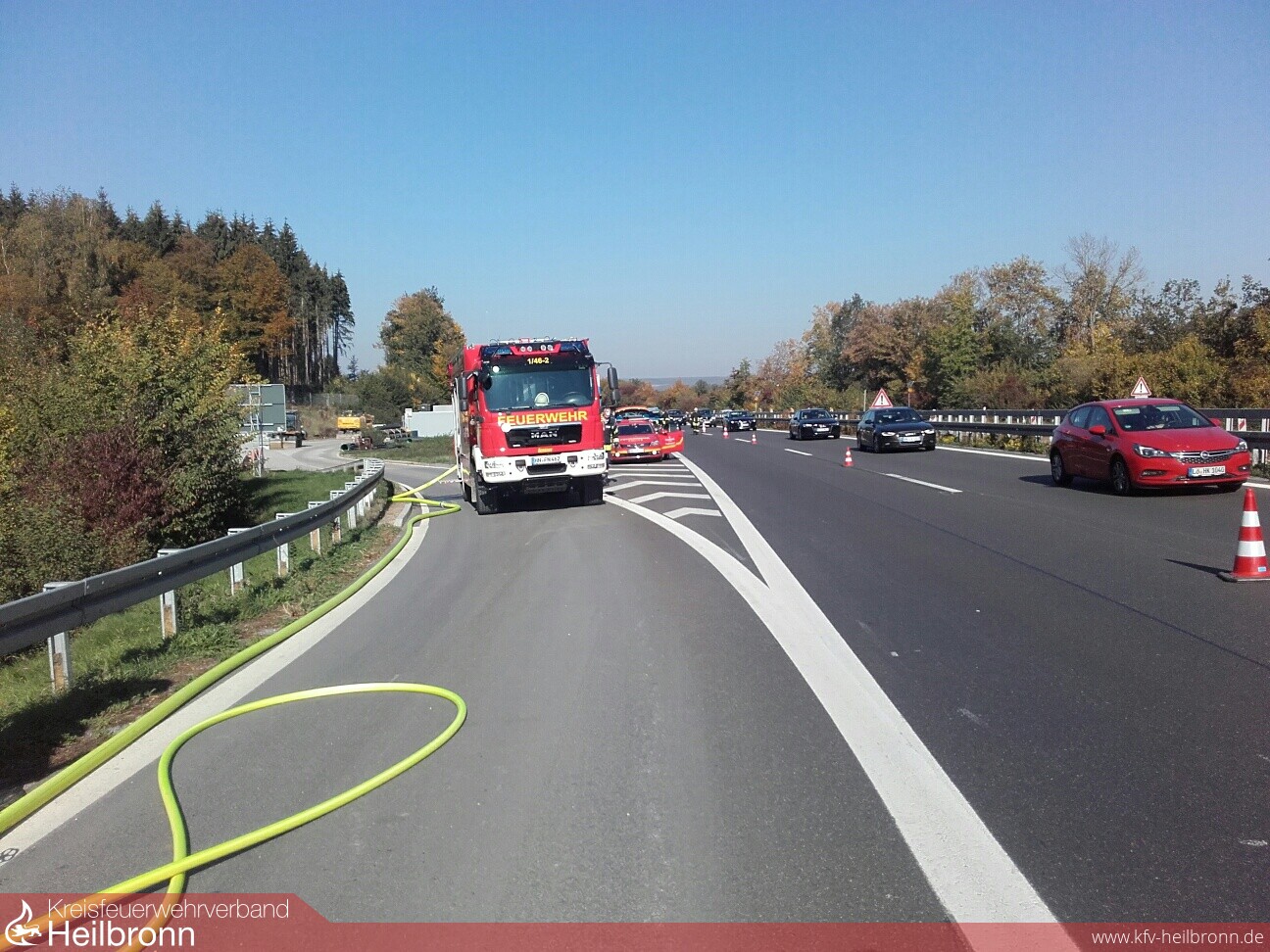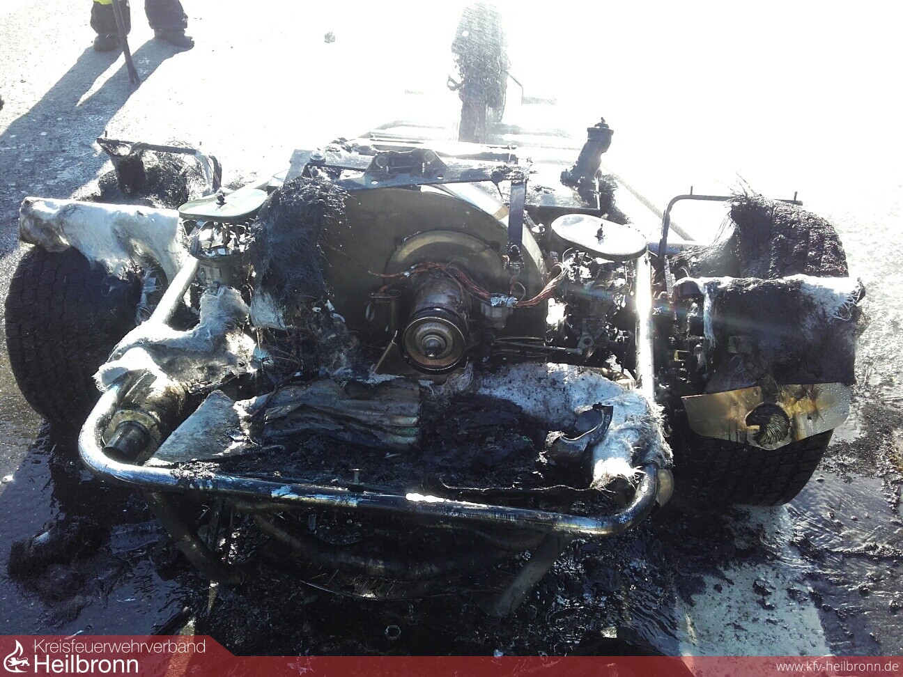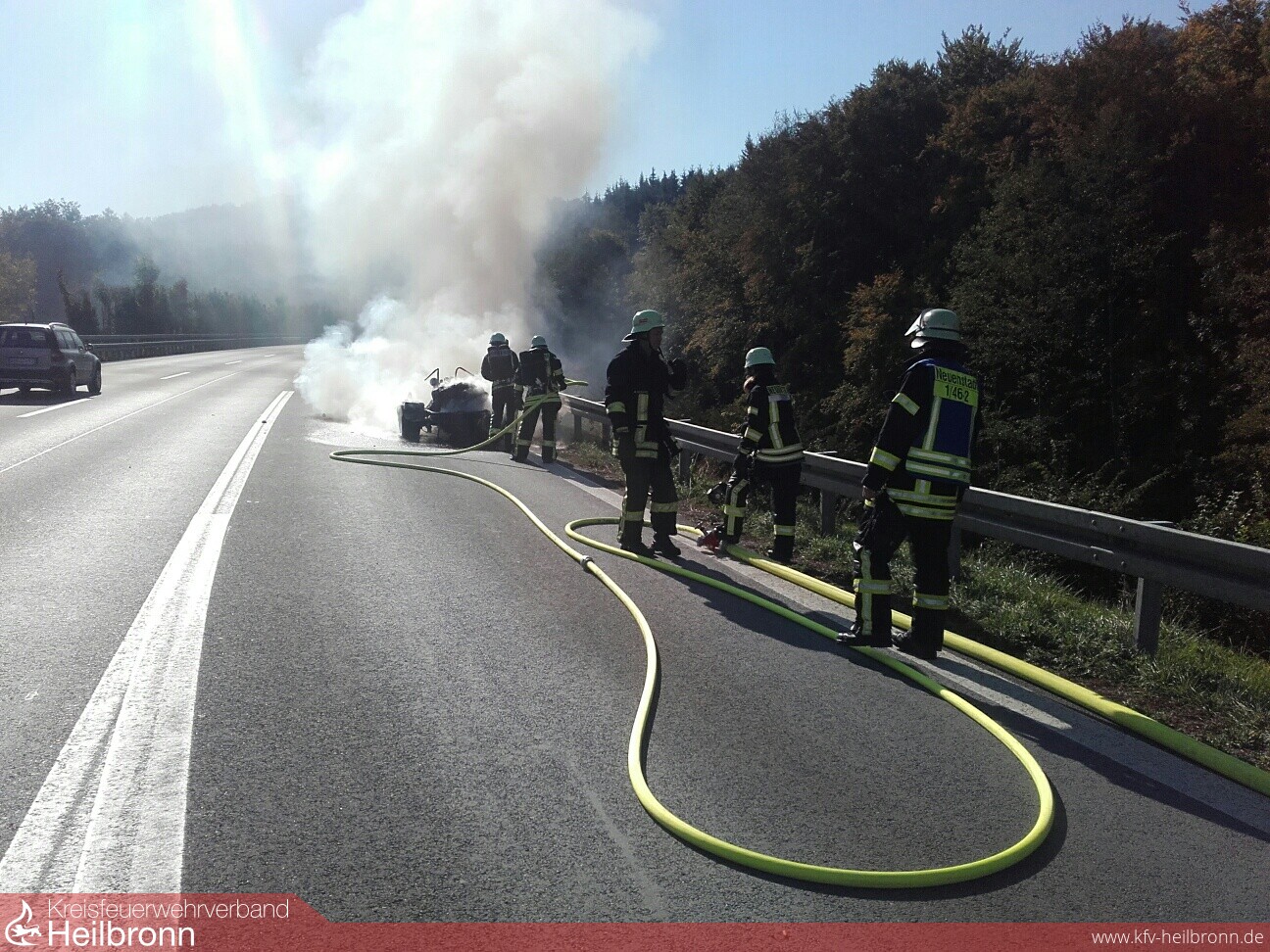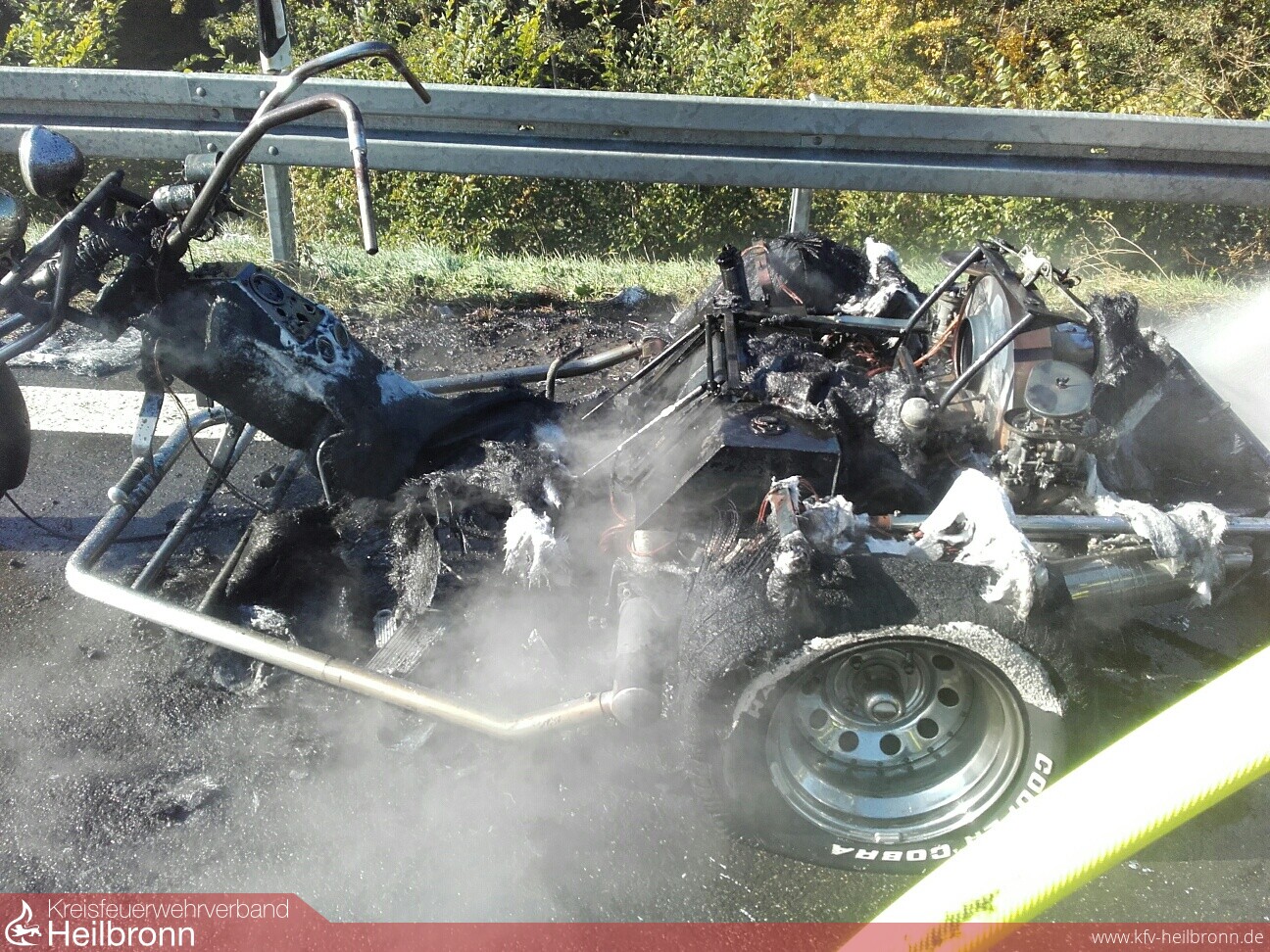 Schon von weitem war die schwarze Rauchsäule zu erkennen. Das Trike stand auf der Standspur und war bereits im Vollbrand. Fahrer und eine Mitfahrerin konnten rechtzeitig das Fahrzeug verlassen und sich in Sicherheit bringen. Der Fahrer hatte während der Fahrt Flammen bemerkt und geistesgegenwärtig vor dem Tunnel Hölzern gehalten. Ein Trupp unter Atemschutz löschte mittels einem C-Rohr den Brand.