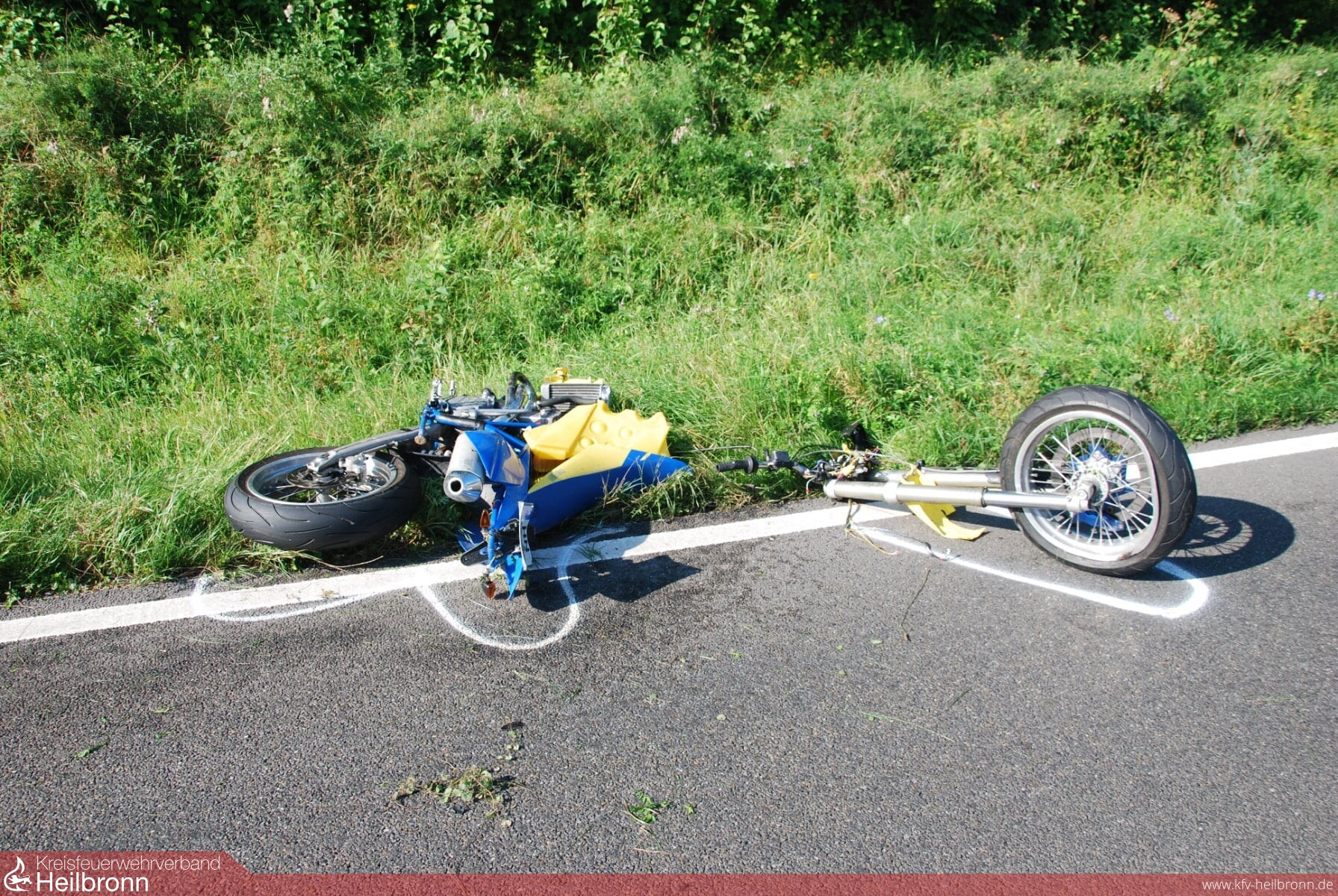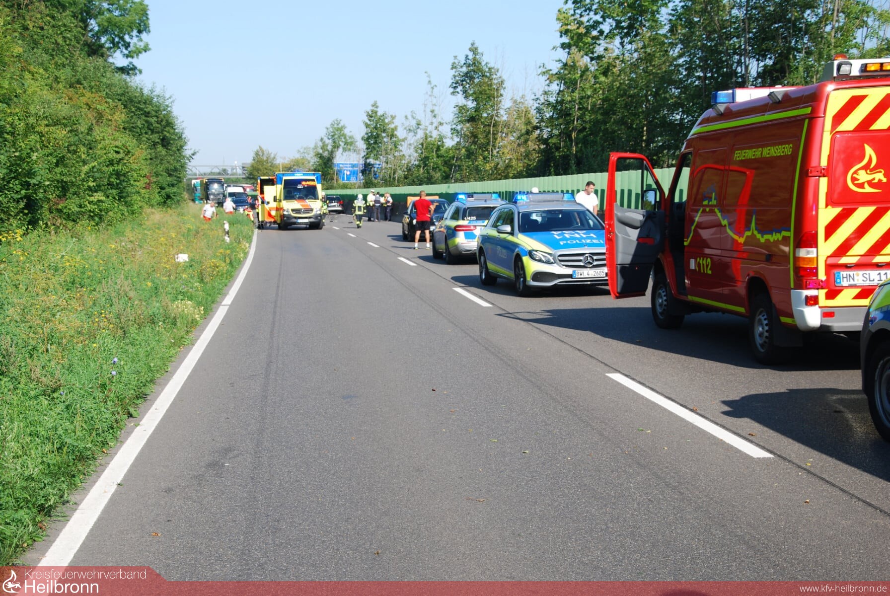 PKW-Brand auf der B 39 war das Stichwort auf den Meldeempfängern der Freiwilligen Feuerwehr Weinsberg am 22.08.2019 um 09:30 Uhr. An der Einsatzstelle befand sich allerdings kein brennendes Fahrzeug, es hatte kurz nach dem Schemelsbergtunnel einen schweren Verkehrsunfall gegeben. Ein Motorradfahrer hatte während eines Überholvorgangs aus Richtung Heilbronn kommend einen entgegenkommenden PKW frontal getroffen. Hierbei entstand ein größeres Trümmerfeld und verschiedene Betriebsstoffe traten aus den Fahrzeugen aus. Der Motorradfahrer erlitt schwerste Verletzungen.
