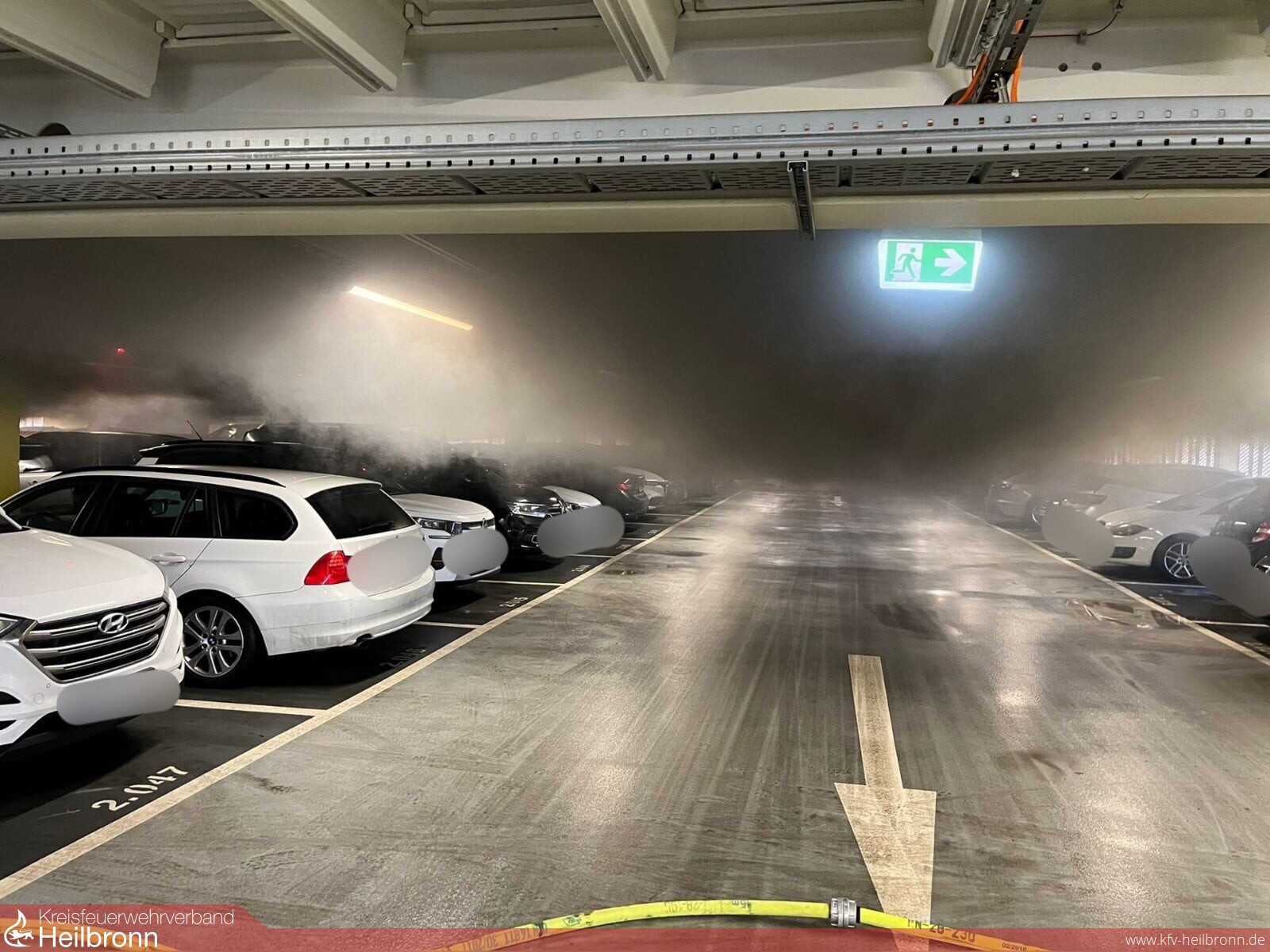 Beim Eintreffen der Einsatzkräfte drang bereits dichter, schwarzer Rauch aus dem sechsstöckigen Parkhaus. Daher begaben sich umgehend mehrere Trupps unter Atemschutz in den Innenangriff. Während der Angriffstrupp zur Brandbekämpfung ins 2. OG vordrang, kontrollierten weitere Trupps die stark verrauchten Geschosse nach Personen. Glücklicherweise befand sich zum Zeitpunkt des Brandes niemand mehr im Gebäude. Aufgrund der Lage wurde im weiteren Einsatzverlauf die Abteilung Obereisesheim hinzugezogen.