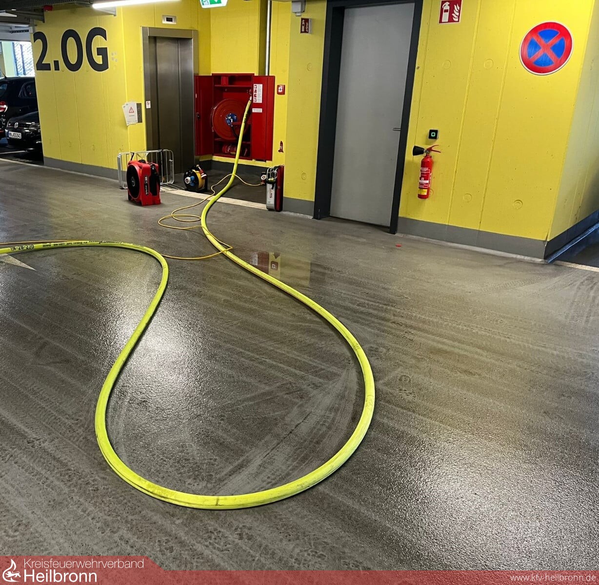 Die Brandbekämpfung erfolgte über ein C-Rohr, das der Angriffstrupp direkt an einen Wandhydranten im 2. OG anschloss. Dieser war an die interne Steigleitung des Parkhauses angebunden, welche wiederum von einem Löschfahrzeug im Außenbereich gespeist wurde. Am Brandherd stellte sich heraus, dass das Feuer bereits auf ein benachbartes Fahrzeug übergegriffen hatte. Durch schnelle und gezielte Löschmaßnahmen des Angriffstrupps konnte eine weitere Ausbreitung verhindert werden. Aufgrund der enormen Hitzeentwicklung wurden jedoch weitere angrenzende Fahrzeuge in Mitleidenschaft gezogen.
