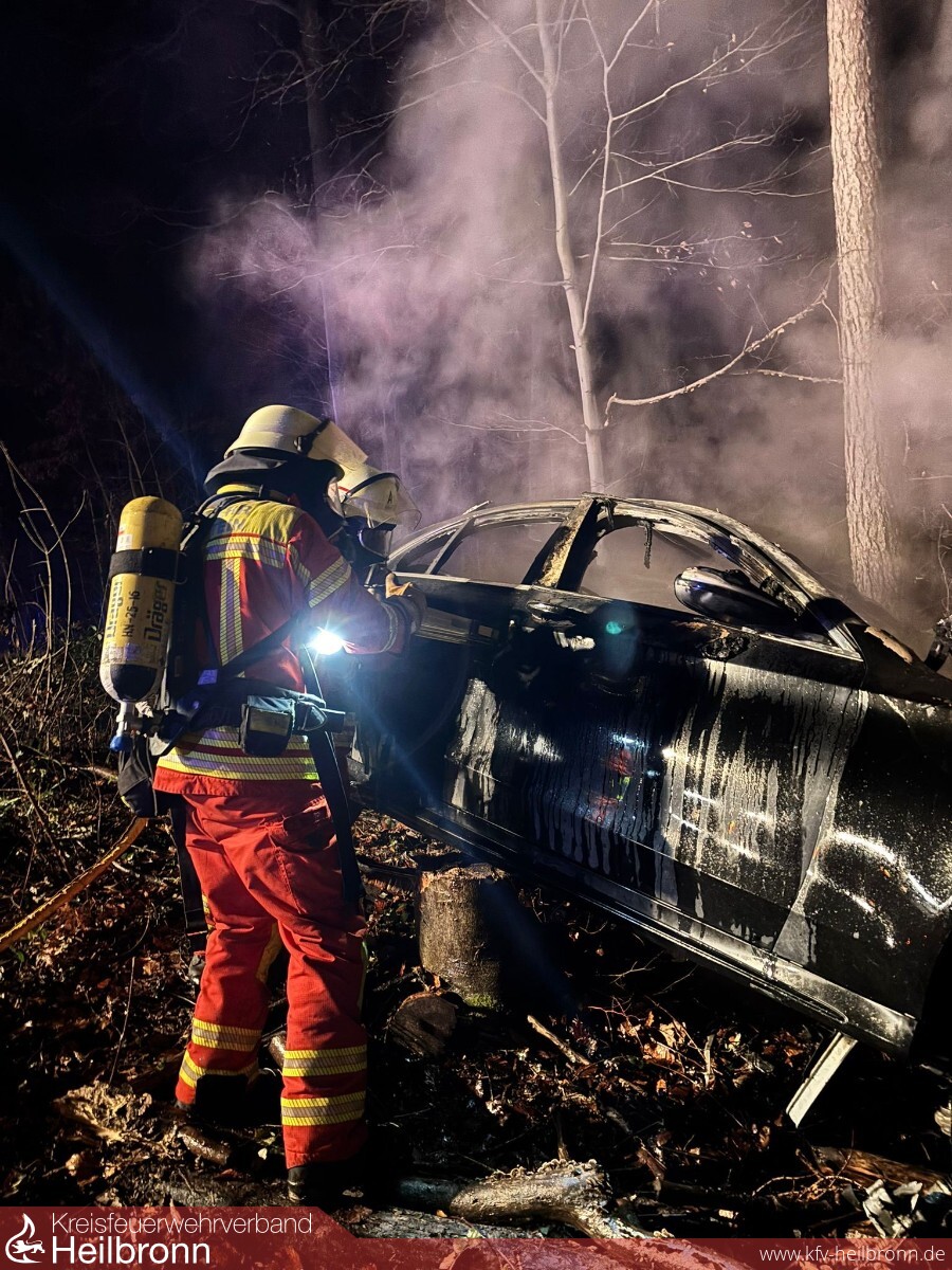 Am Donnerstagabend um kurz nach 19 Uhr ist bei Löwenstein ein Mercedes bei einem Unfall in Flammen aufgegangen. Nach Angaben der Polizei wollte der 27 Jahre alte Fahrer eines Mercedes in einer scharfen Rechtskurve einem Reh ausweichen, weshalb er von der Straße abkam und in einem Waldstück im Unterholz zum Stehen kam.